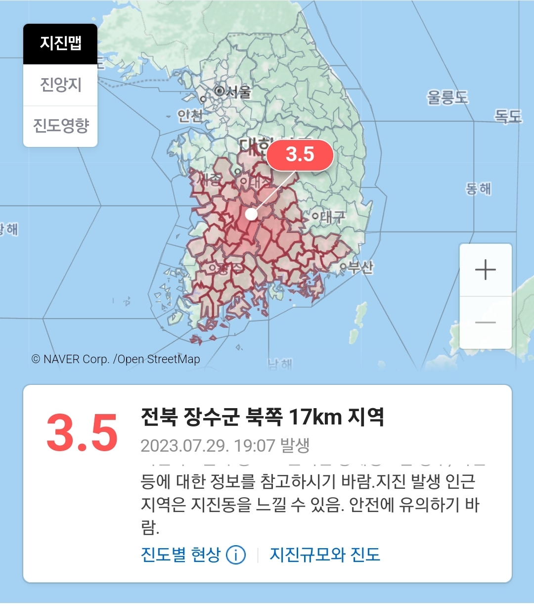 - 충남, 충북, 경북, 대전, 전남 지역에서는 진도 3의 흔들림이 전달되었으며, 고층 건물에서 현저하게 느낄 수 있었습니다.