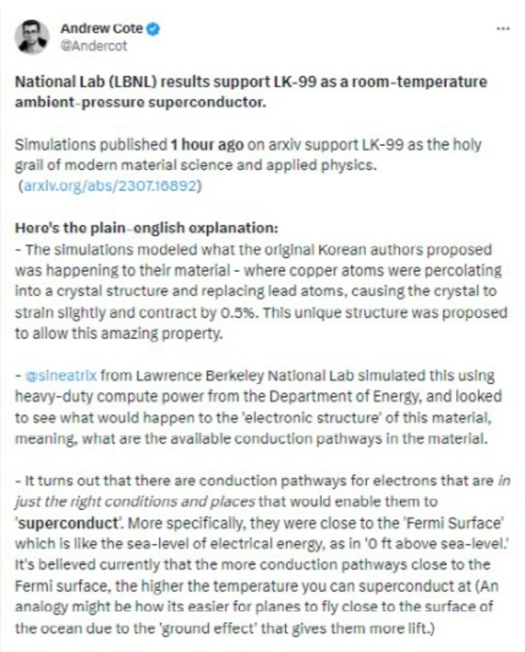 또한, 미 연구팀은 LK-99에서 전자의 에너지 분포가 '페르미 표면'에 가까운데, 이는 페르미 표면에 가까운 전도 경로가 많을수록 초전도 현상이 일어날 수 있는 온도가 높아짐을 의미한다고 설명했습니다. 이러한 결과는 초전도 현상을 위한 새로운 이론적 가능성을 제시하는 것입니다.