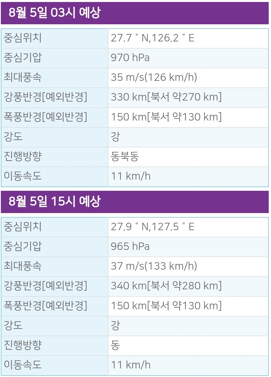 카눈은 4일 금요일에 이동 속도가 느려질 예정이며, 이후 북동쪽으로 이동해 일본 규슈 지방에 영향을 미칠 것으로 보인다. 국내 상륙 가능성은 현저히 낮아졌으며, 일본 기상청도 비슷한 예보를 내놓았다. 제주 지역은 현재 예상 진로에서 완전히 제외되었다.