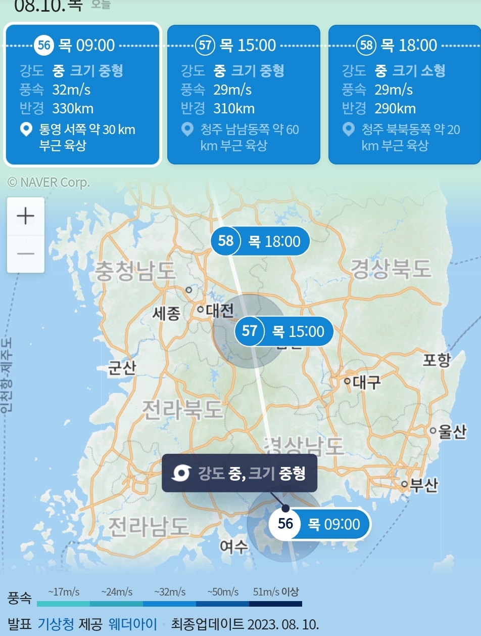 제6호 태풍인 카눈은 전날 제주 서귀포 동남동쪽 210㎞ 해상까지 북상하였다. 중심 기압은 970h㎩, 최대풍속은 초속 35m(시속 126㎞)로, 이후 밤사이 제주 동쪽 해상을 지나 통영 남쪽 약 140km 해상에 다다르며 강도 '강'을 유지하였다.
