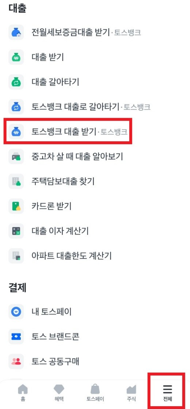 대출을 진행하려면 토스앱을 실행하고, 메뉴 하단에서 맨 오른쪽에 위치한 '전체'를 선택해주세요. 스크롤을 쭉 내려 '대출'을 찾고, 그 아래에 위치한 '토스뱅크 대출받기'를 클릭하십시오.