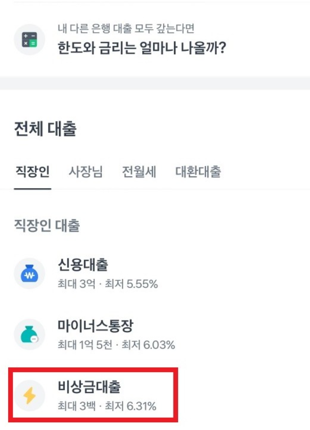 이후 상단 메뉴에서 "빌리기"를 선택한 다음, "비상금대출"을 클릭하면 대출 가능 여부를 확인할 수 있습니다.