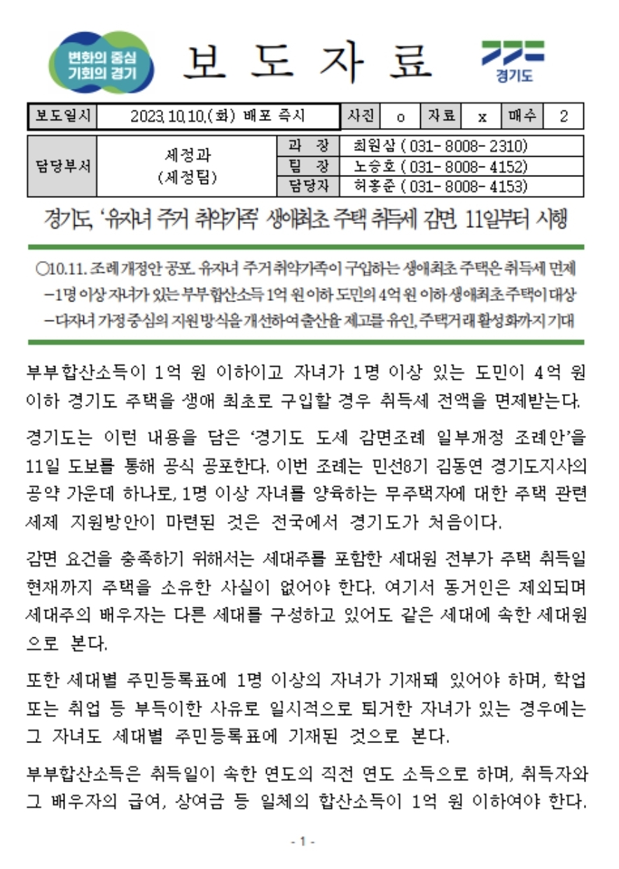 경기도 부부합산소득 1억원 이하 자녀있는 도민 4억원 이하 주택 최초 구입시 취득세 면제