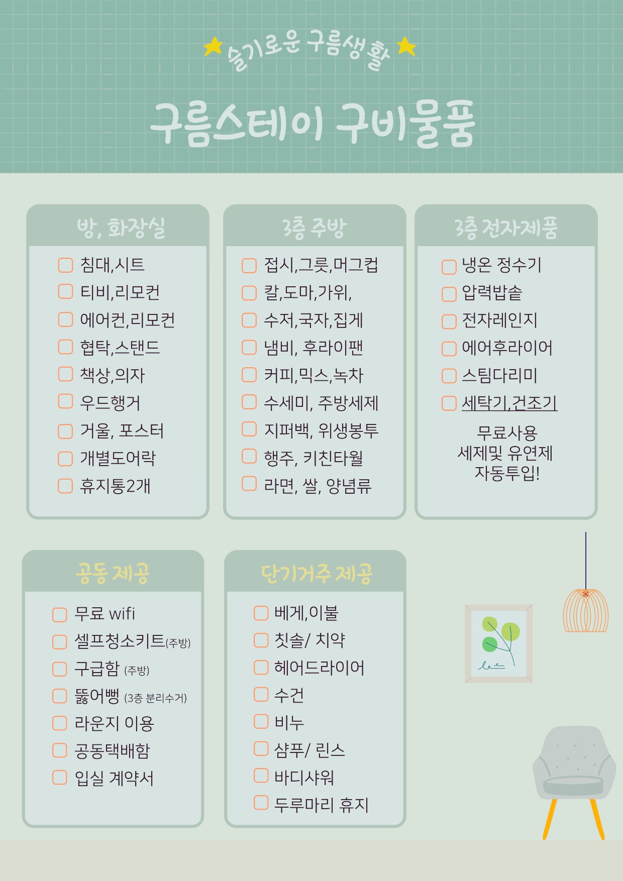 5. 편의: 최신 가전기기 및 생활필수품 무료 제공, 생활비 절약 가능.
