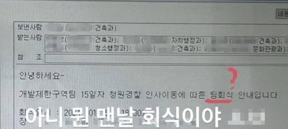또한, 불법 건축물과 관련된 공문 사진을 게시하며 민원인에 대한 불만을 표현하고, 자주 열리는 팀 회식에 대해서도 불만을 나타냈습니다.