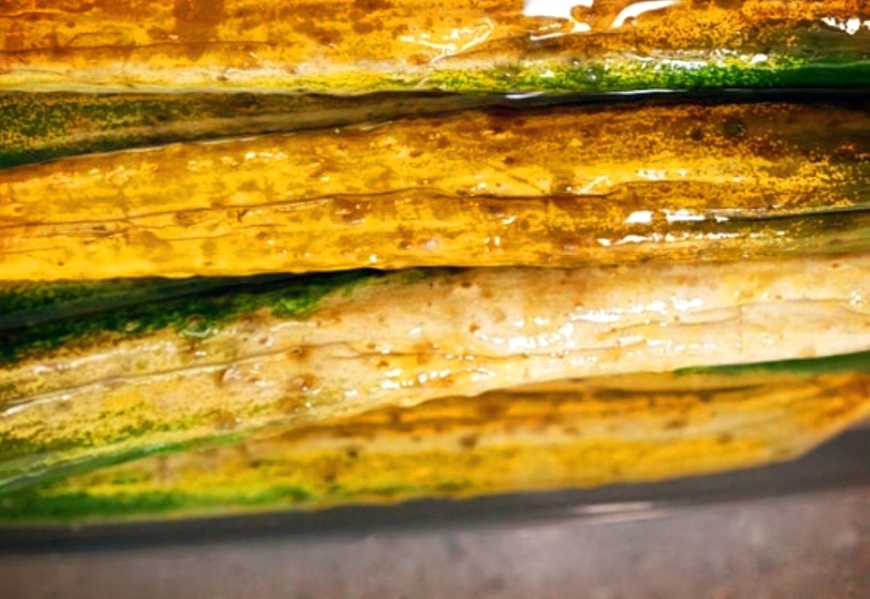 실온에서 하루에 한두 번 정도 뒤집어가며 위치를 바꾸어 줍니다. 약 4-5일쯤 지나면 오이가 쪼글쪼글해지고 절임물이 나옵니다. 이때부터 냉장 보관을 시작합니다. 숙성 과정에서 오이의 색이 노랗게 변하며, 오이에서 수분이 충분히 빠져나옵니다. 숙성된 오이지는 아삭하고 맛있게 먹을 수 있습니다.