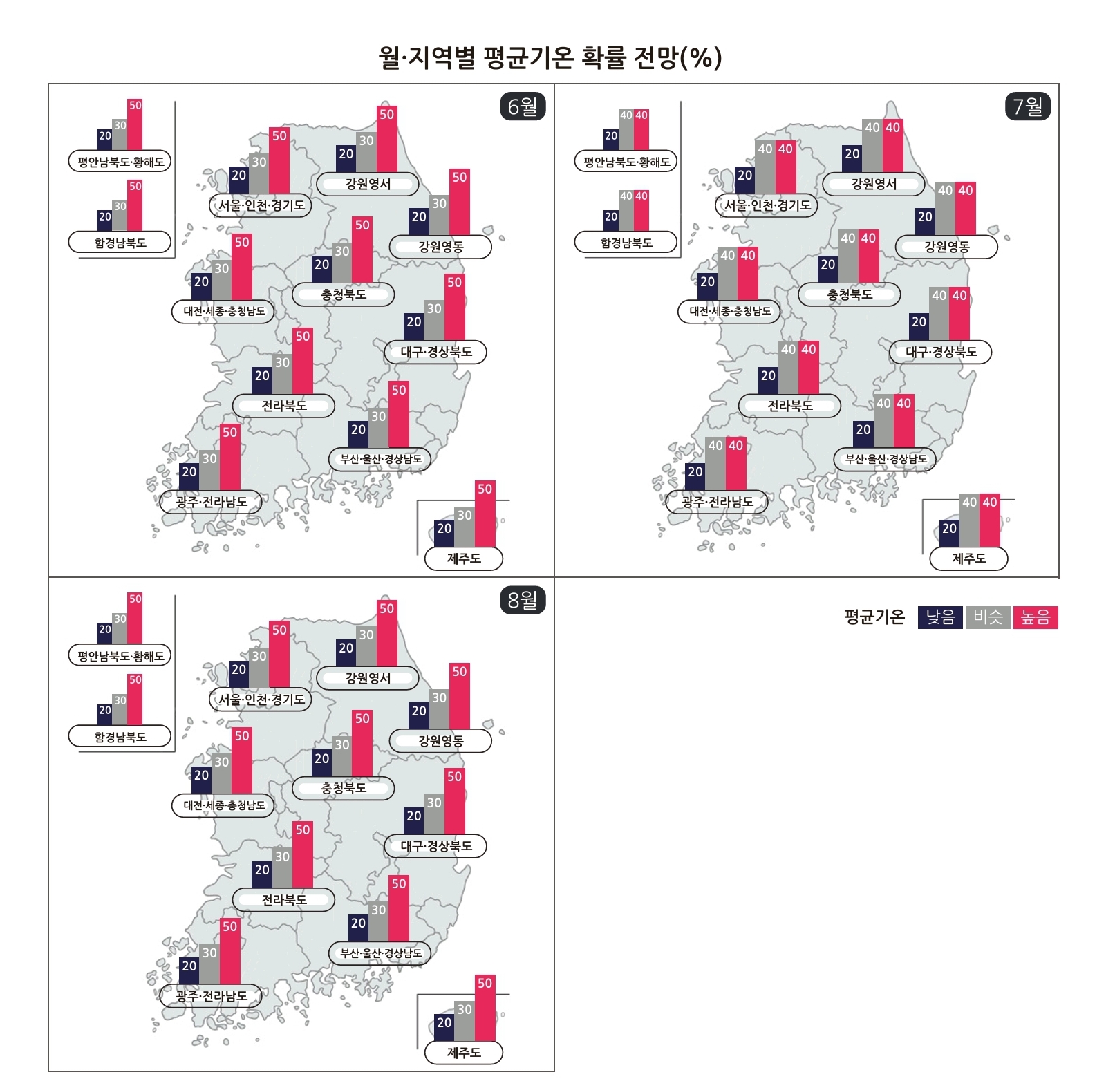 - 기온: 6월의 월평균 기온이 평년(21.5~22.1℃)보다 높을 확률은 50%입니다. 이는 평년보다 더 더운 날씨가 될 가능성이 크다는 것을 의미합니다.