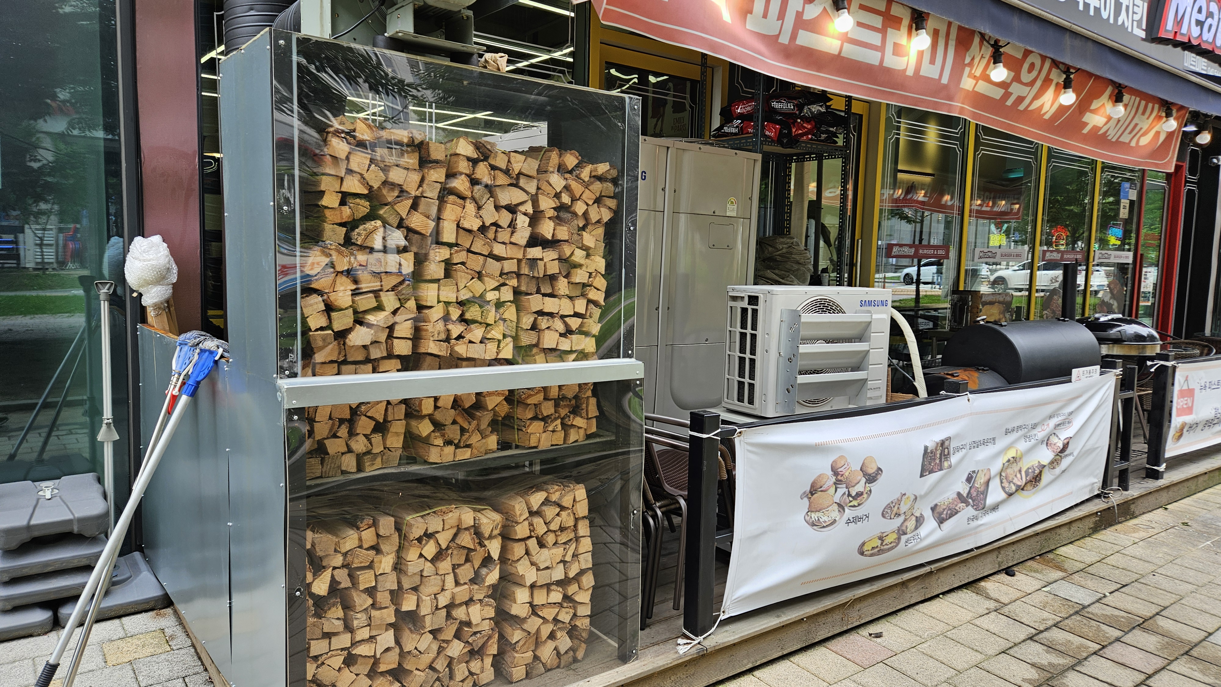 천안 불당동에 위치한 이 맛집 앞에 도착하자마자 눈에 확 들어온 건 뭐였을까요? 바로 입구 주변에 가득 쌓인 참나무 장작들이었어요! 이걸 보는 순간 '오늘 제대로 된 바베큐를 먹겠구나' 하는 기대감에 벌써 입안에 군침이 돌더라고요. ㅎㅎ