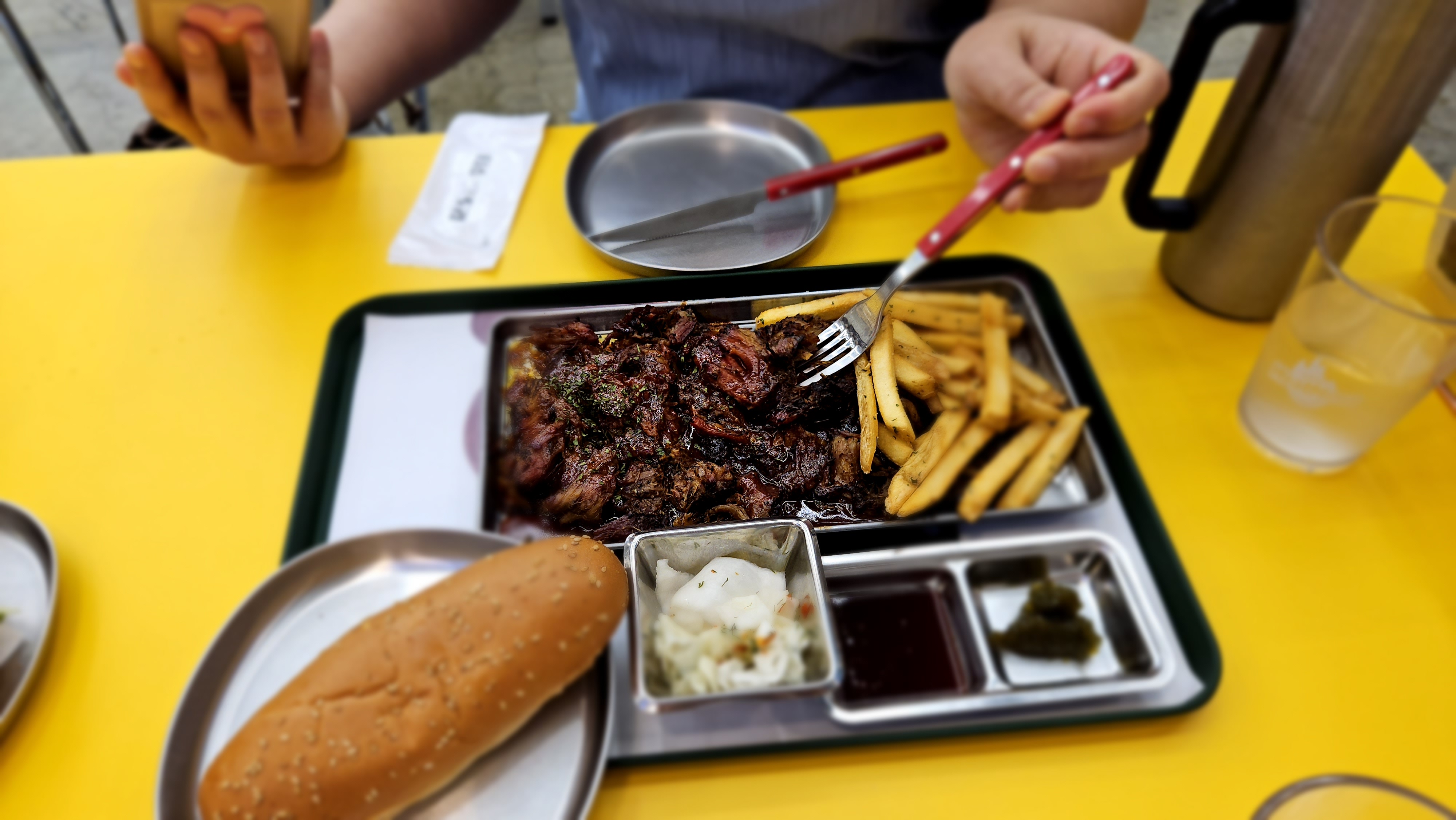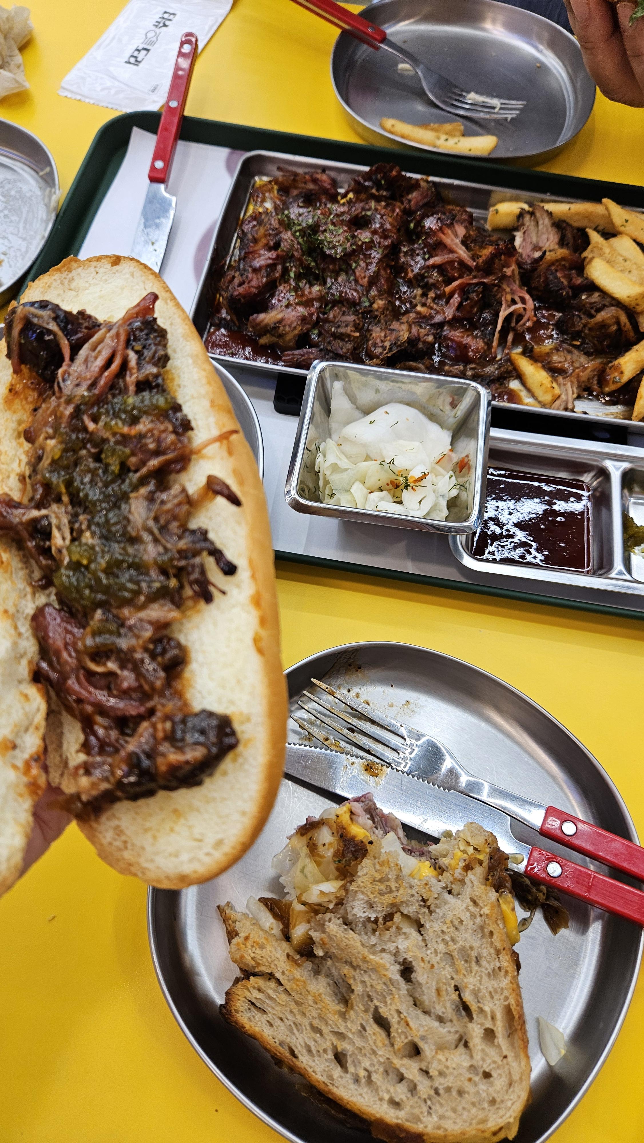 먼저 나온 할라피뇨 풀드포크를 한입 먹는 순간, 정말 깜짝 놀랐어요! 10시간 동안 저온에서 조리해서 그런지 고기가 입에서 살살 녹는 느낌이었거든요. 할라피뇨의 매콤함이 풀드포크의 고소함과 어우러져 계속 먹게 되더라고요. 혼자 먹다가 '아, 이거 친구들이랑 같이 왔어야 했는데!' 하는 생각이 들 정도였어요.