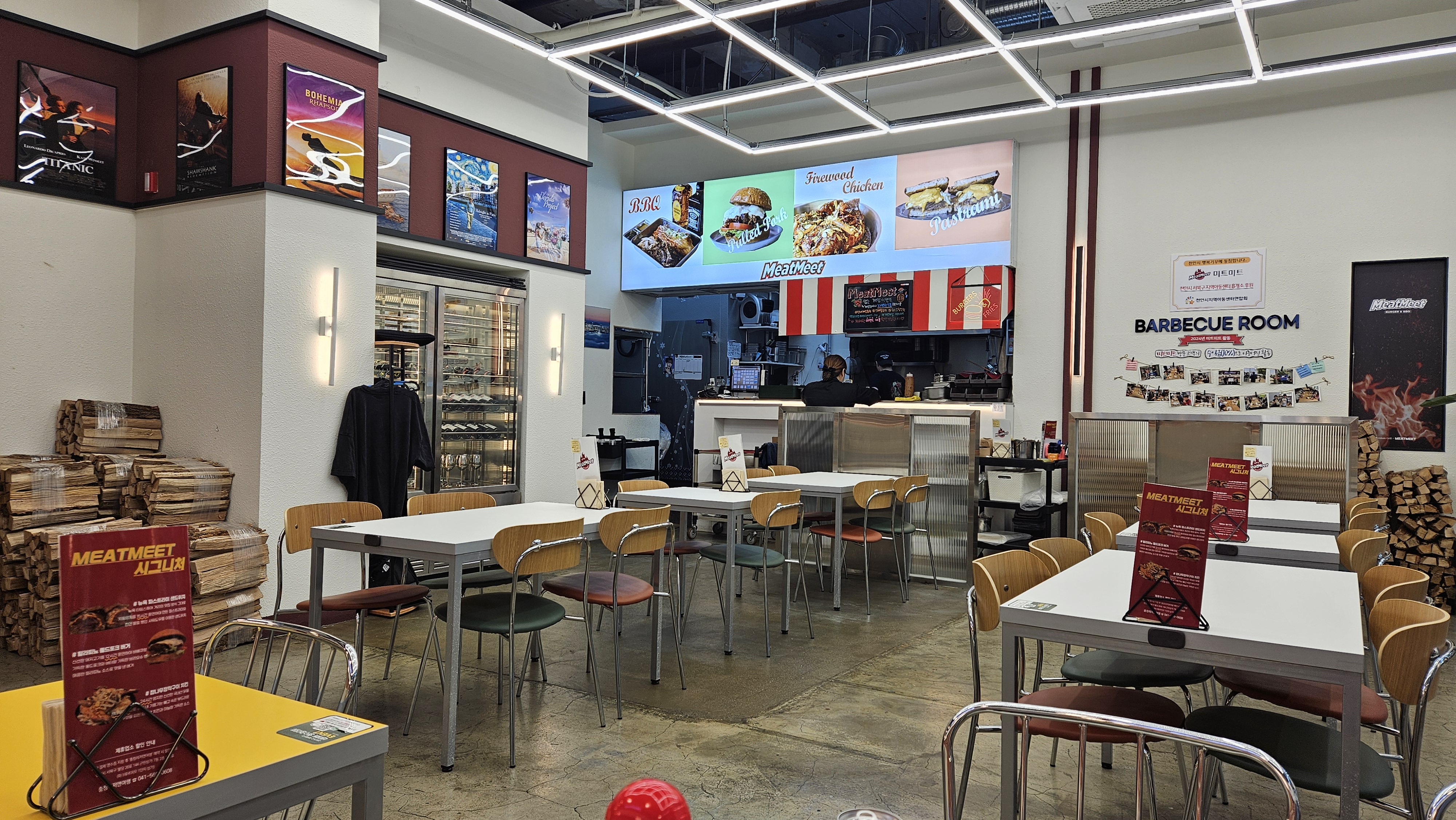 문을 열고 들어가니 웬걸, 깔끔하고 모던한 인테리어에 또 한 번 놀랐어요. 벽면에는 영화 포스터들이 걸려있어 구경하는 재미도 쏠쏠했답니다. 음악도 적당히 흘러나와 분위기가 너무 좋았어요. 테이블 간격도 넉넉해서 옆 테이블 대화가 신경 쓰이지 않아 좋더라고요.