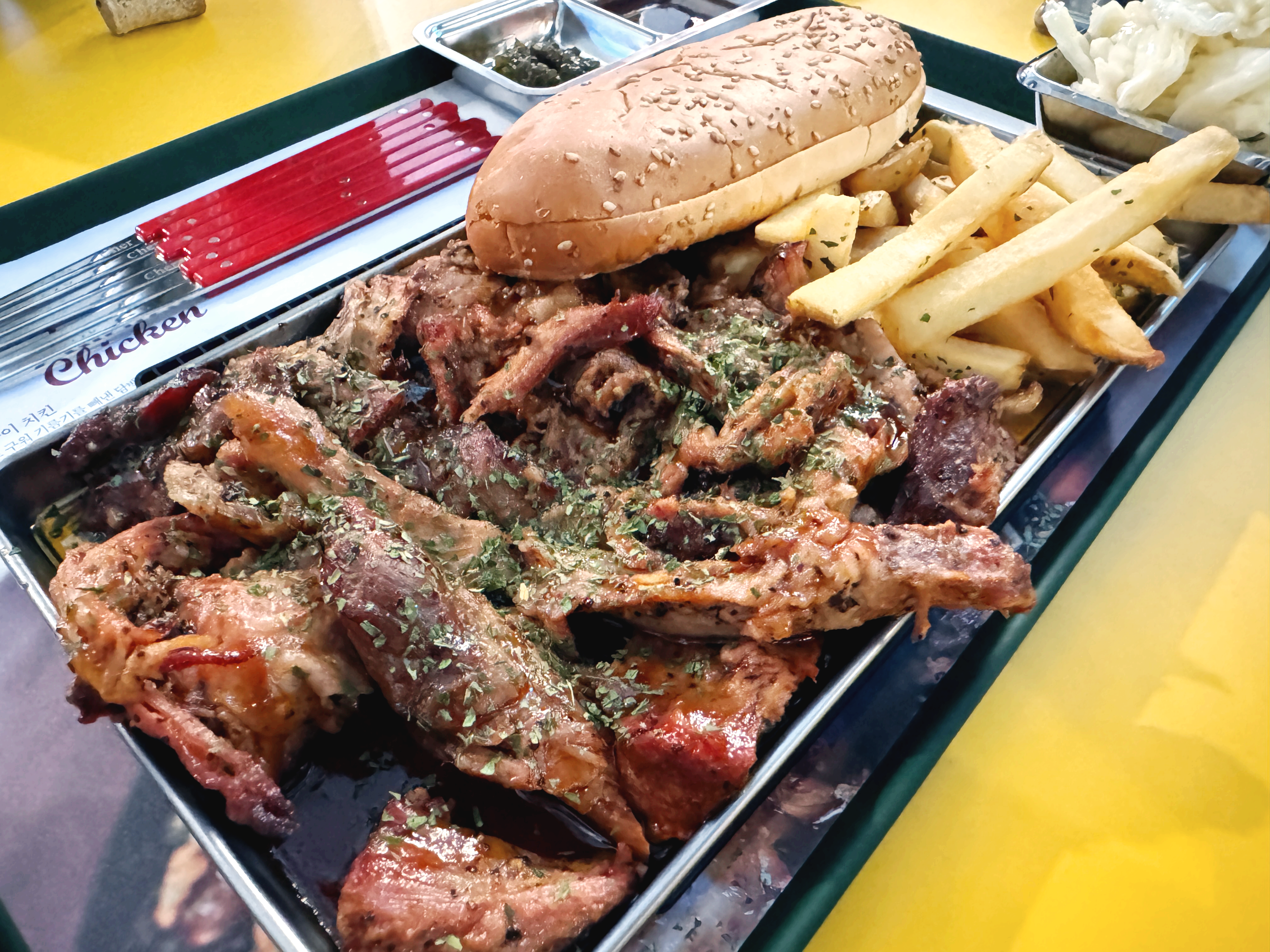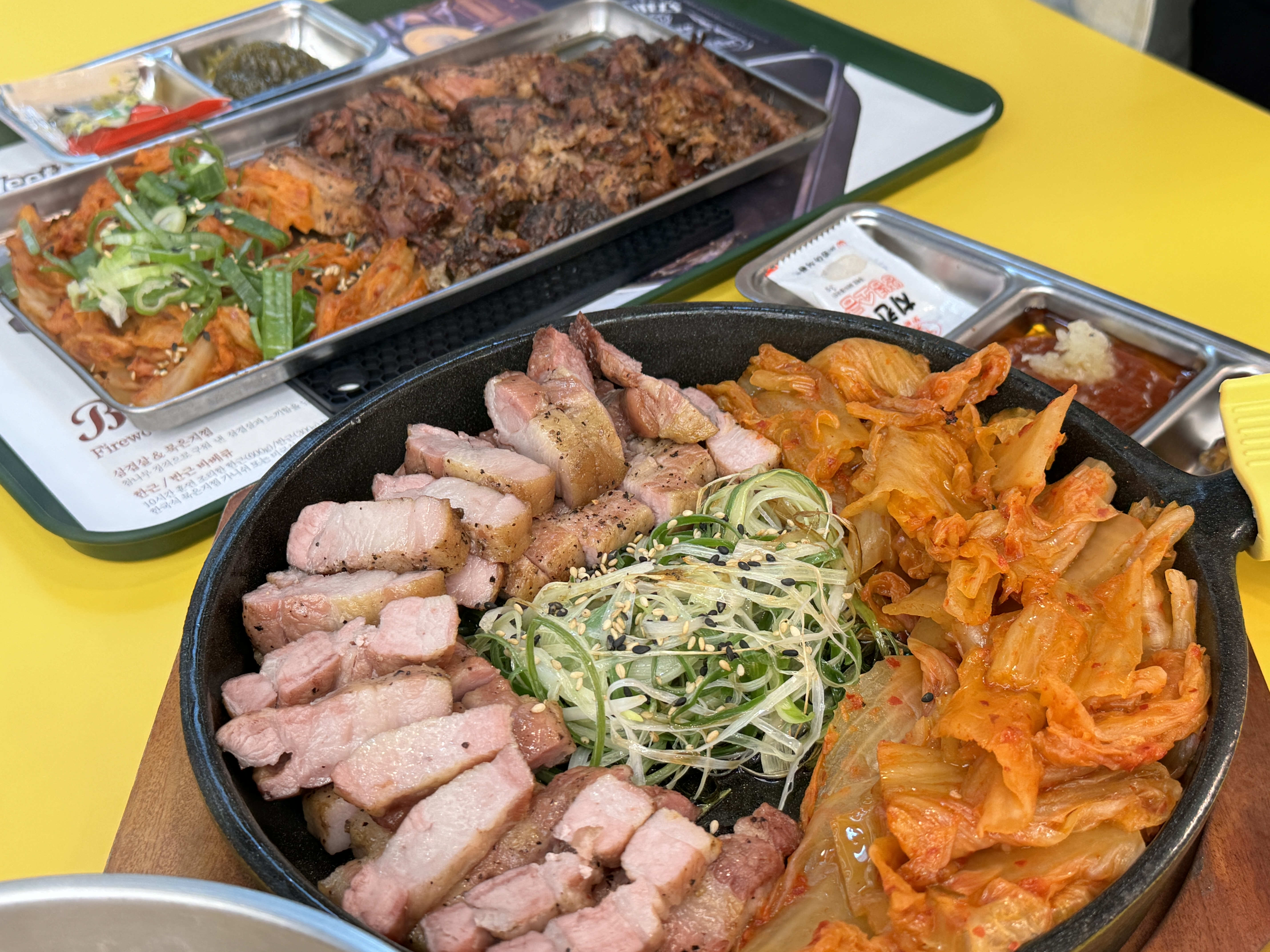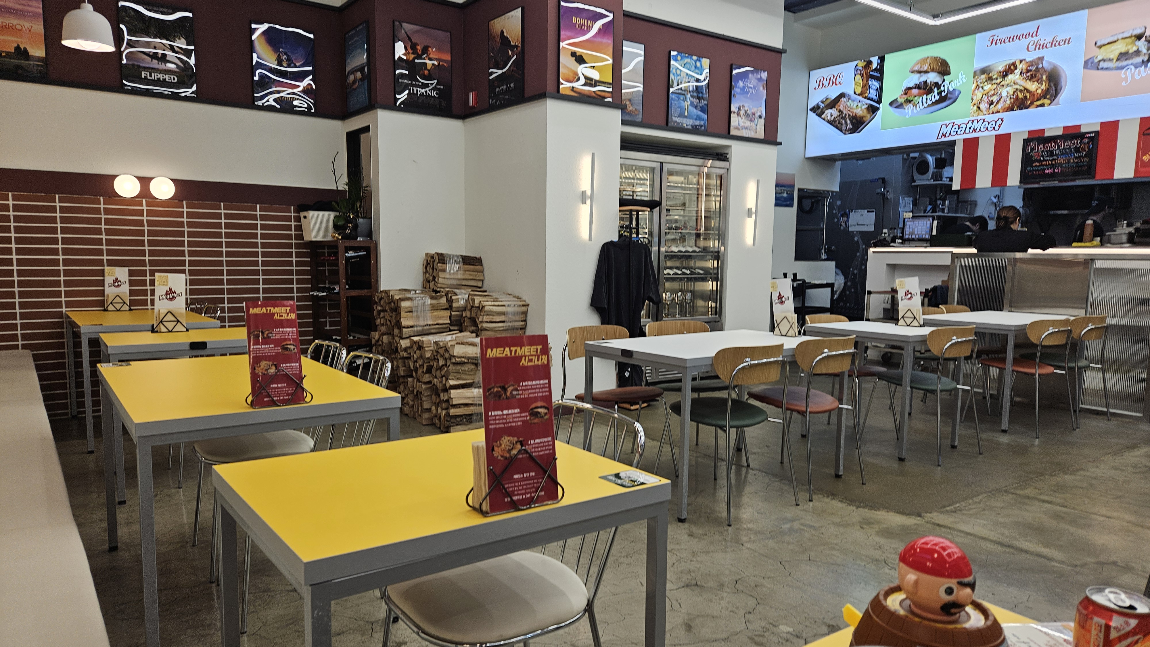 매장 내부는 전체적으로 넓고 깔끔하게 꾸며져 있습니다. 화이트와 옐로우 컬러의 테이블이 패스트푸드 전문점 같은 느낌의 힙한 감성을 주는데, 이는 인스타그램에 업로드할 만한 멋진 사진을 찍기에도 좋은 배경이 됩니다. 또한 매장 한켠에 놓인 장작이 이곳에서만 맛볼 수 있는 특별한 장작구이 메뉴를 기대하게 만듭니다.