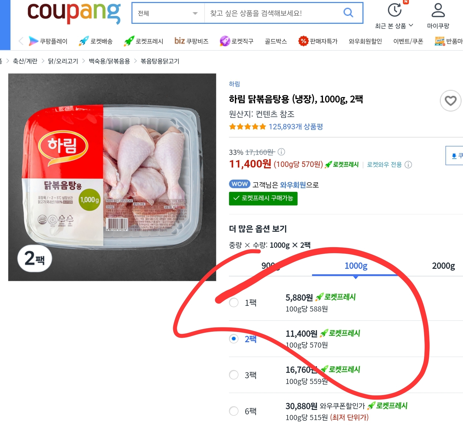 하림 닭볶음탕용 1kg 2팩 11,400원 세일중!