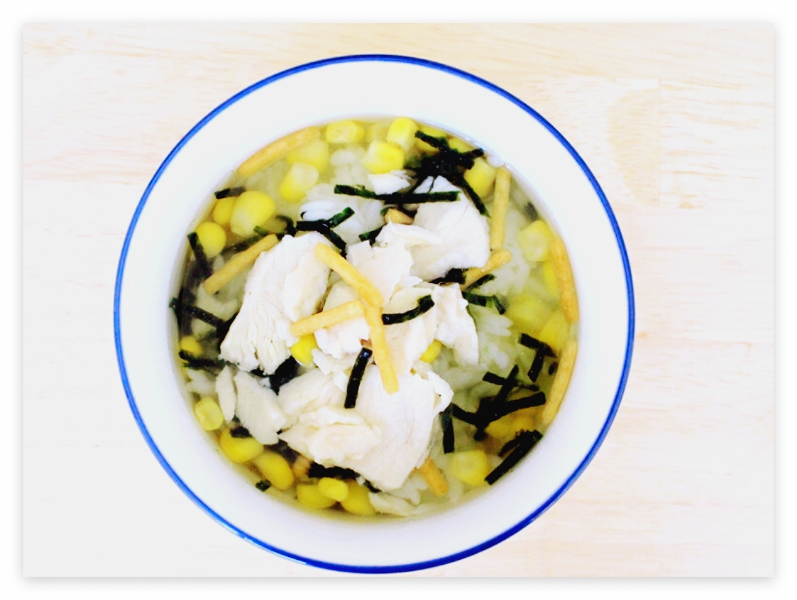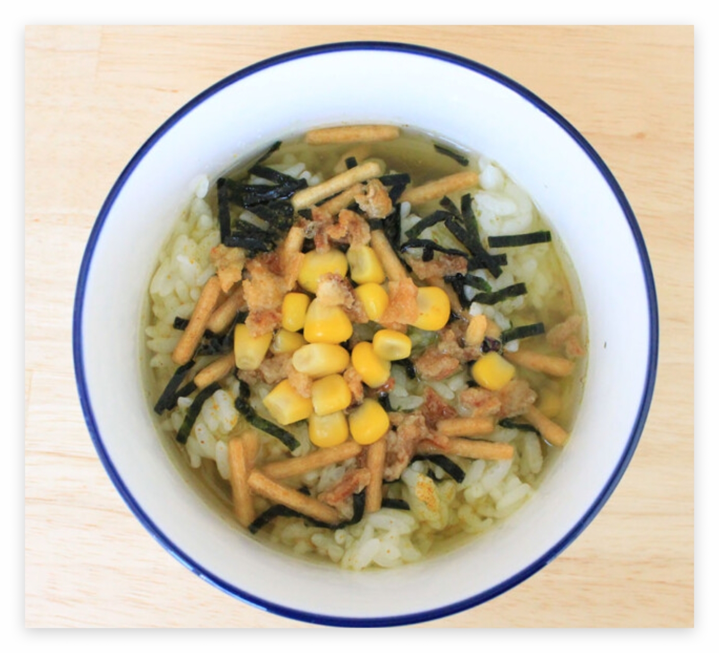 가장 기본적인 형태로, 잘게 부순 김을 밥 위에 얹고 뜨거운 물이나 차를 부어 먹는 오차즈케입니다. 김의 짭짤한 맛과 차의 고소한 향이 어우러져 간단하면서도 깊은 맛을 느낄 수 있습니다.