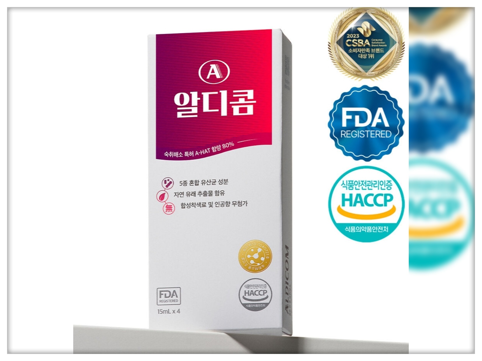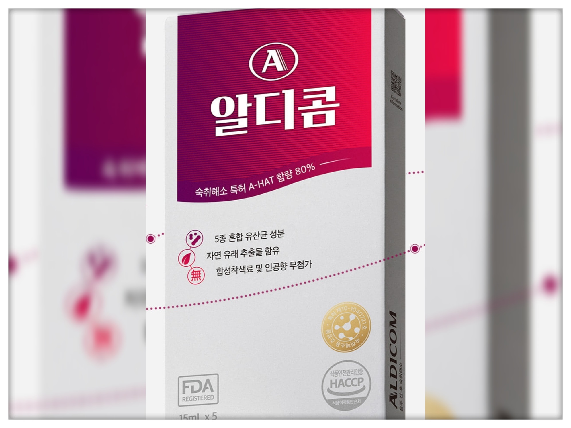 알디콤은 현재 편의점, 약국, 올리브영 등 다양한 채널에서 구매할 수 있는 숙취해소제입니다. 특히 주목할 만한 점은 FDA OTC에 등록된 특허 성분 A-HAT이 함유되어 있다는 것인데요. 이 성분은 한국인의 체질에 맞춰 개발되어 두통, 구토, 설사와 같은 다양한 숙취 증상을 효과적으로 관리해줍니다.