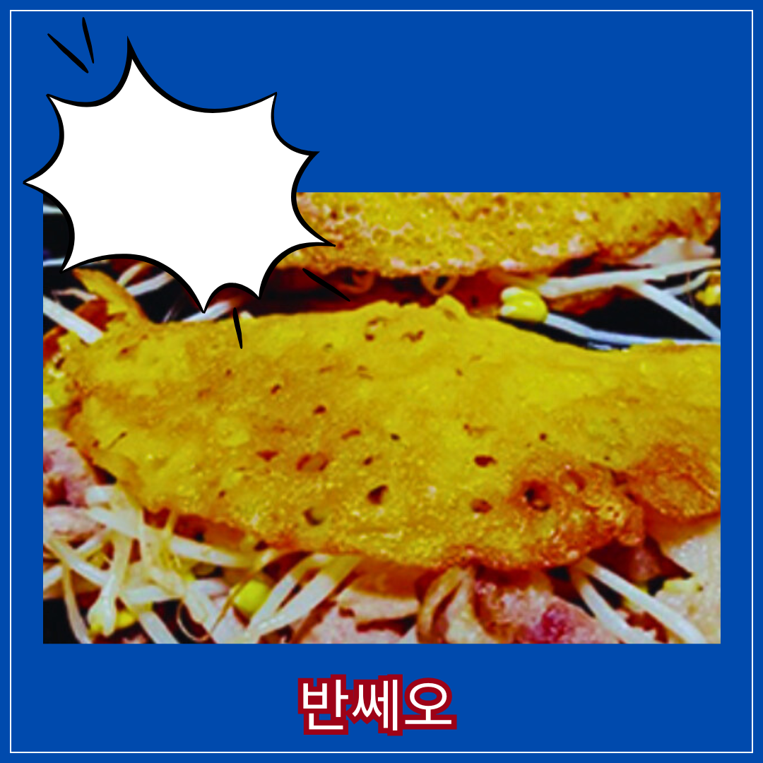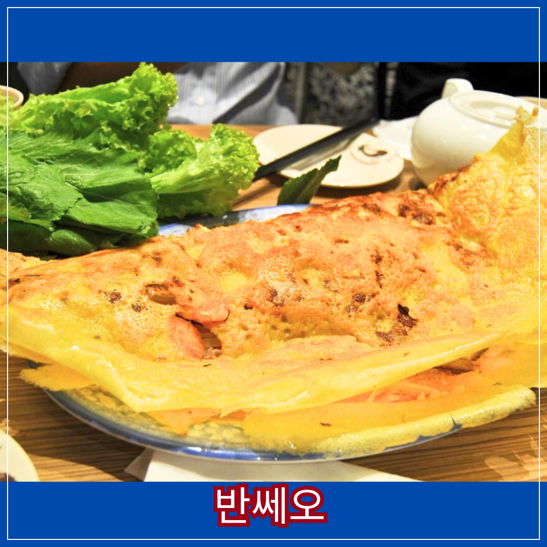 반쎄오는 쌀가루 반죽에 다양한 채소, 고기, 해산물을 넣고 반달 모양으로 접어 부쳐낸 베트남의 대표적인 음식입니다. 우리나라의 전이나 부침개와 유사한데, 외국에서는 타코나 오믈렛과 비슷한 음식으로 알려져 있어요. 베트남 길거리 음식 중 하나로 여행 시 꼭 맛봐야 할 음식입니다.