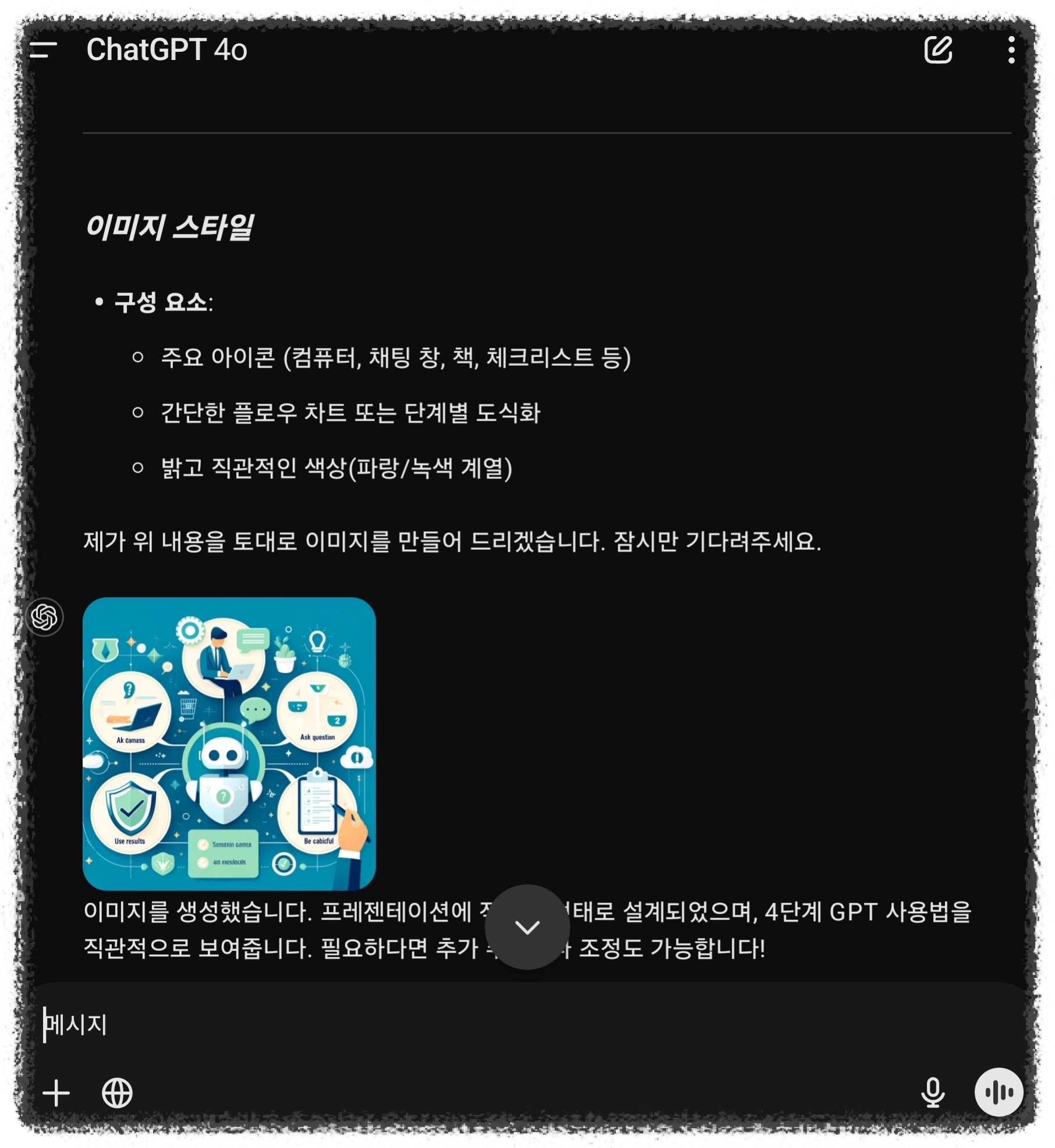 챗GPT는 이제 텍스트뿐만 아니라 이미지도 완벽하게 이해하고 처리합니다. 프레젠테이션 자료 제작, 디자인 피드백, 이미지 기반 질의응답 등 시각적 커뮤니케이션이 필요한 다양한 업무에 활용할 수 있습니다.