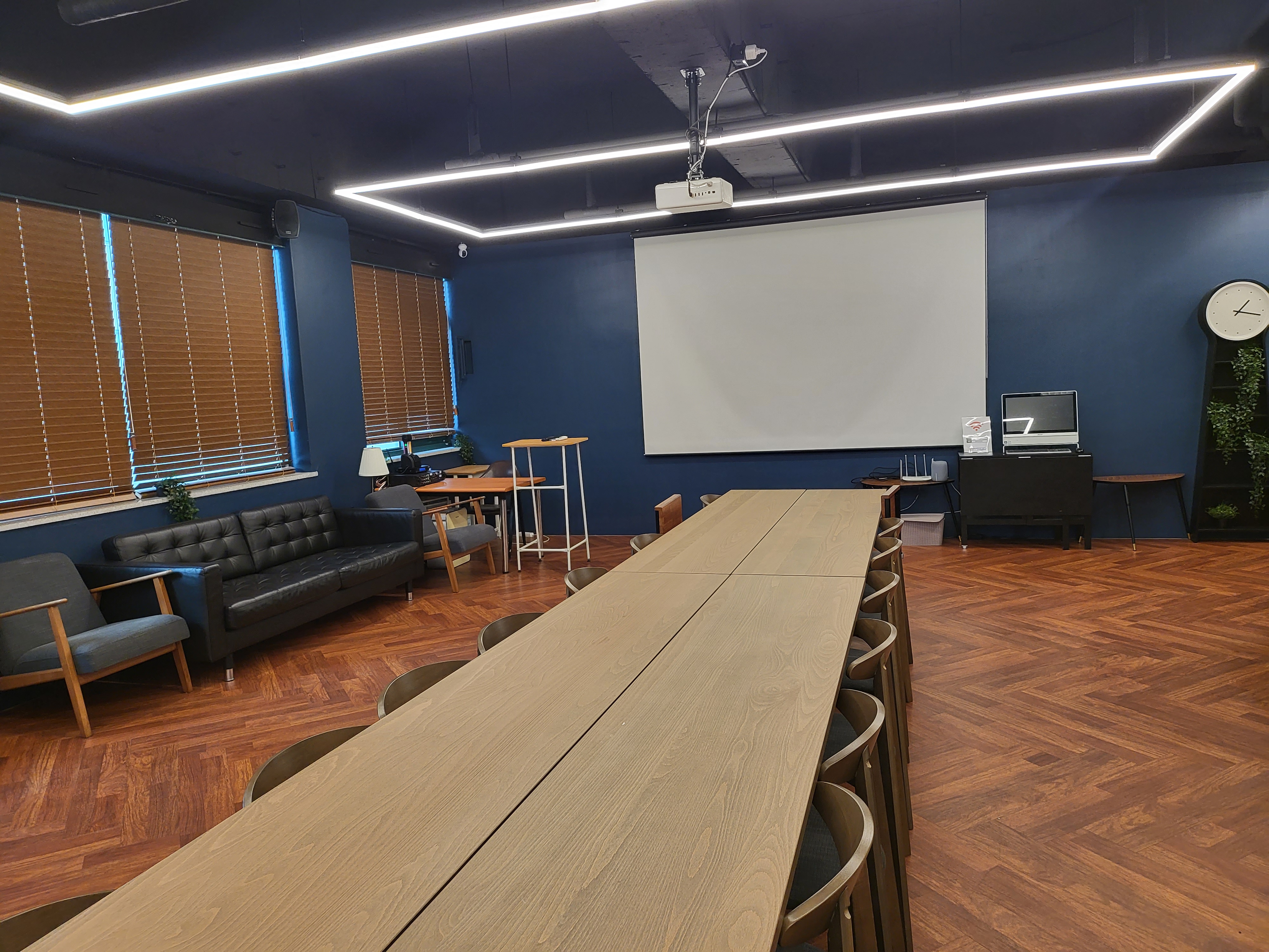 2층은 밝고 깨끗한 화이트 테마의 공간으로, 최대 15명을 수용할 수 있습니다. 43인치 이동형 모니터와 블루투스 스피커, 커피포트 등이 구비되어 있어 소규모 미팅이나 스터디 모임, 친목 모임에 적합합니다. 두 공간 모두 쾌적한 환경을 위한 냉난방 시스템과 초고속 Wi-Fi를 제공합니다.