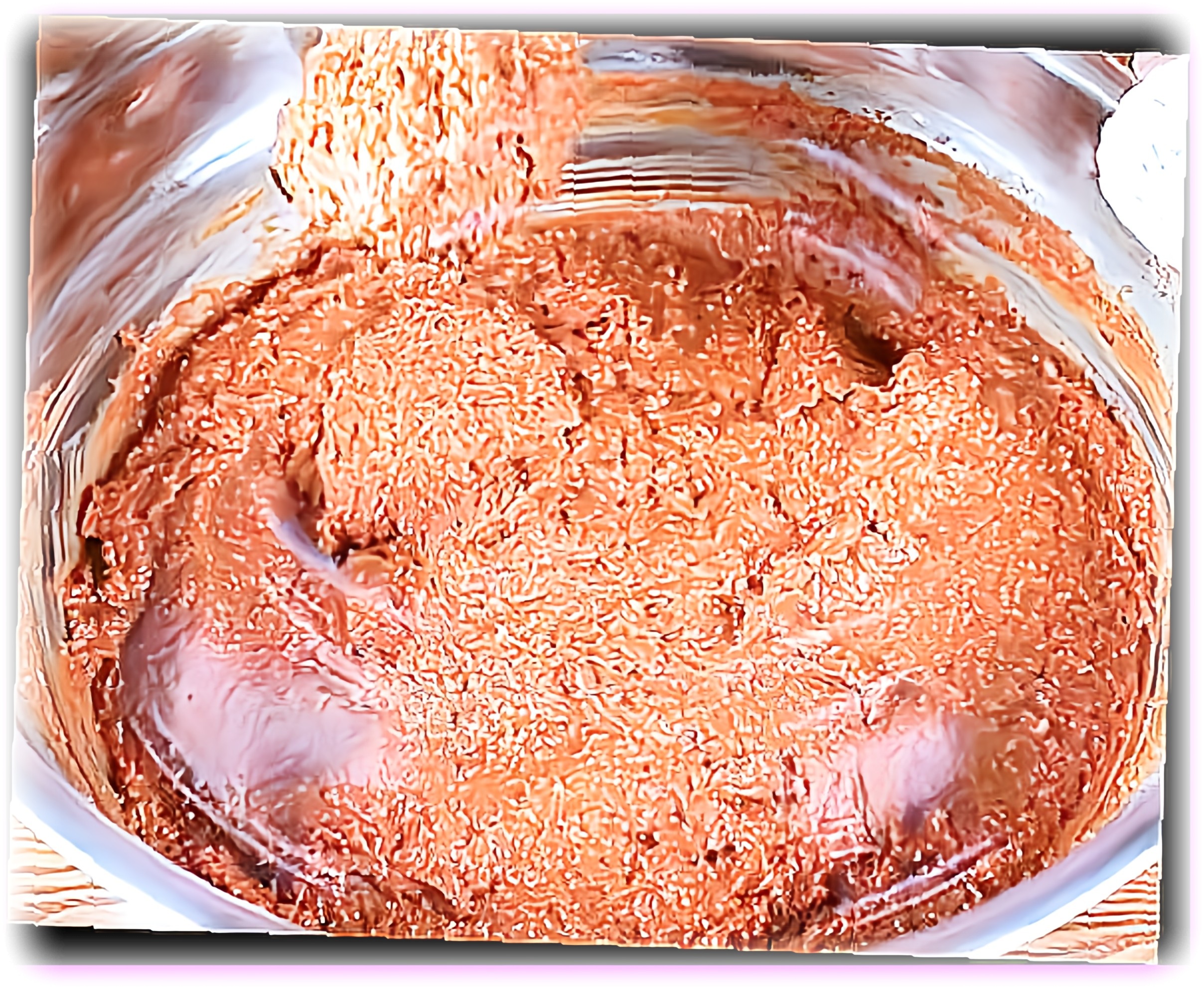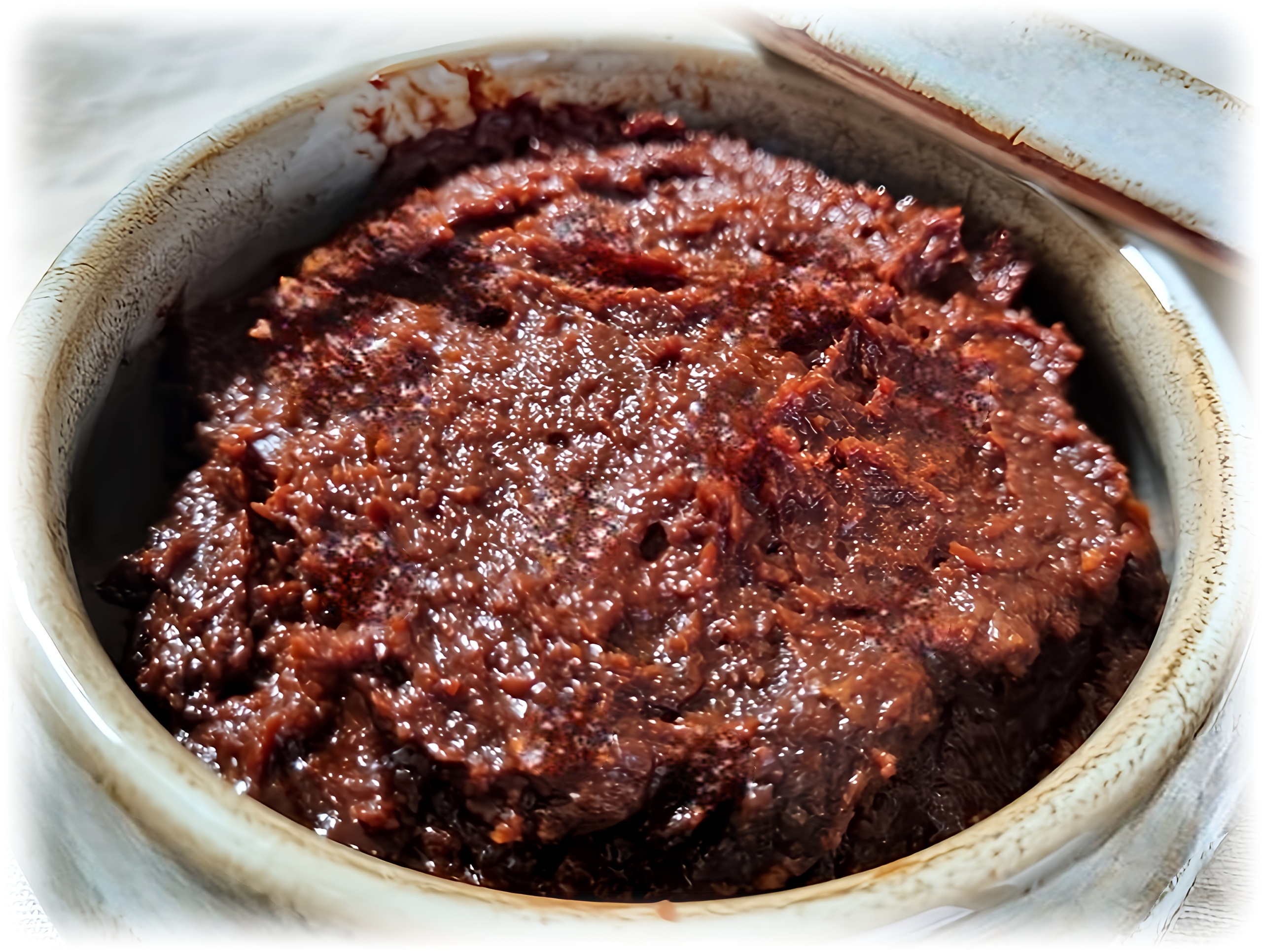 조청물에 미리 준비한 메줏가루와 고추씨를 넣고 골고루 섞습니다. 거품기를 사용하면 혼합 과정이 수월해집니다. 모든 재료가 고르게 섞였다면 막장의 기본 베이스가 완성됩니다.