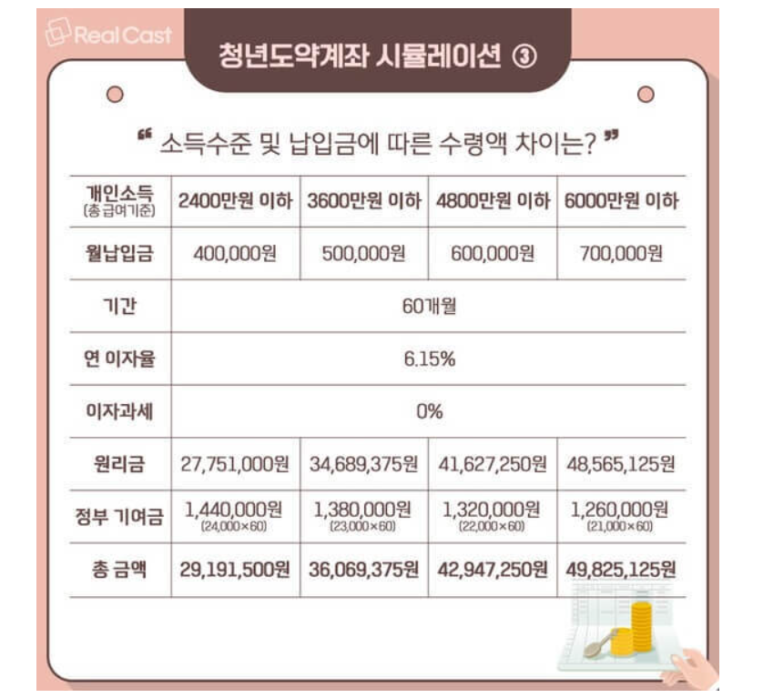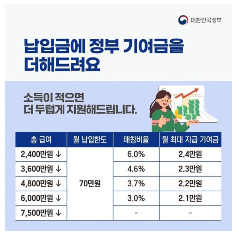 개인의 소득 수준과 납입하는 금액에 따라 달라지게 됩니다. 매월 납입하는 적금이 40 ~ 70만 원 사이라면, 정부기여금으로 3%에서 6% 정도 즉 21,000원에서 24,000원 사이를 지원합니다. 아무래도 소득 수준이 낮을수록 더 많은 기여금의 혜택을 받을 수 있습니다.