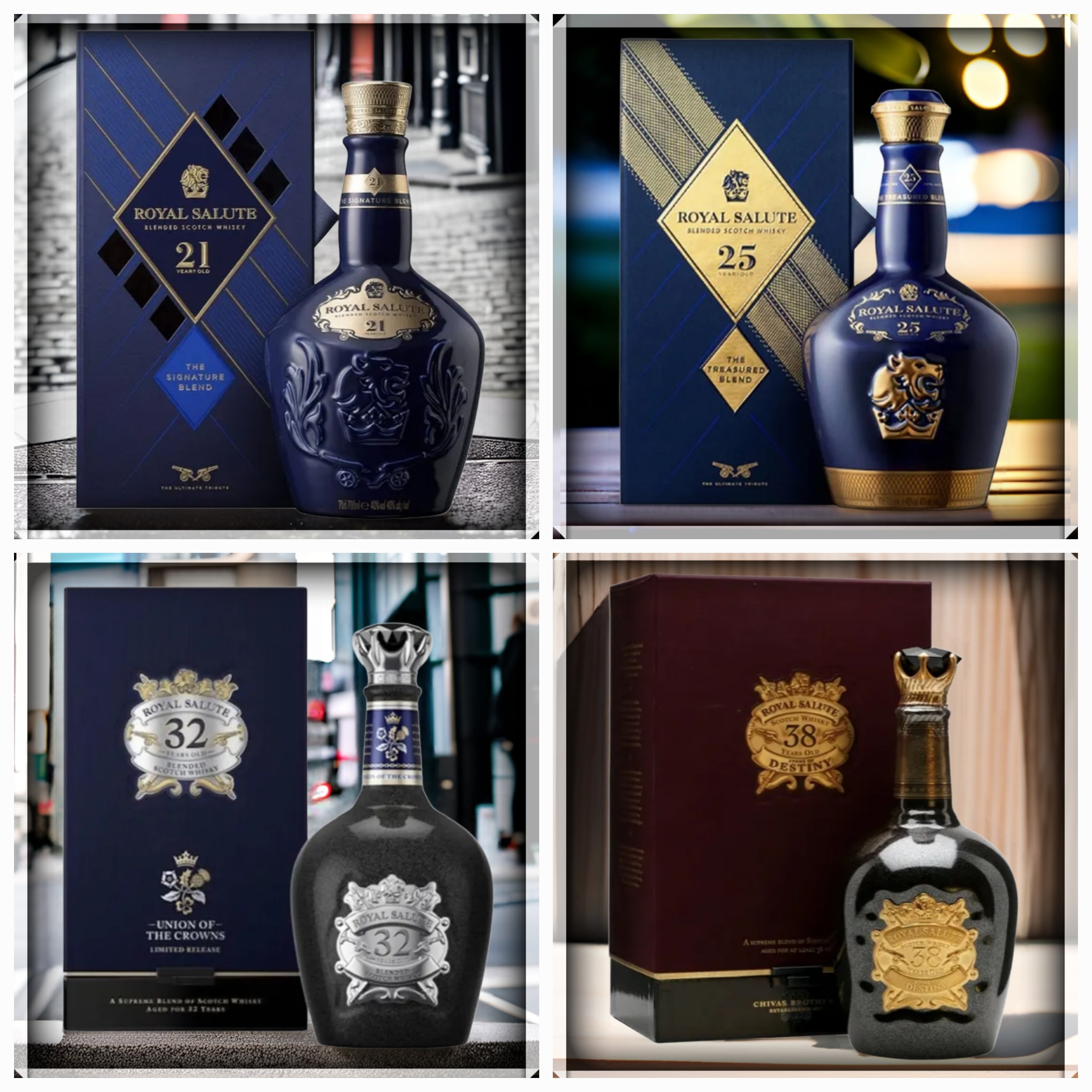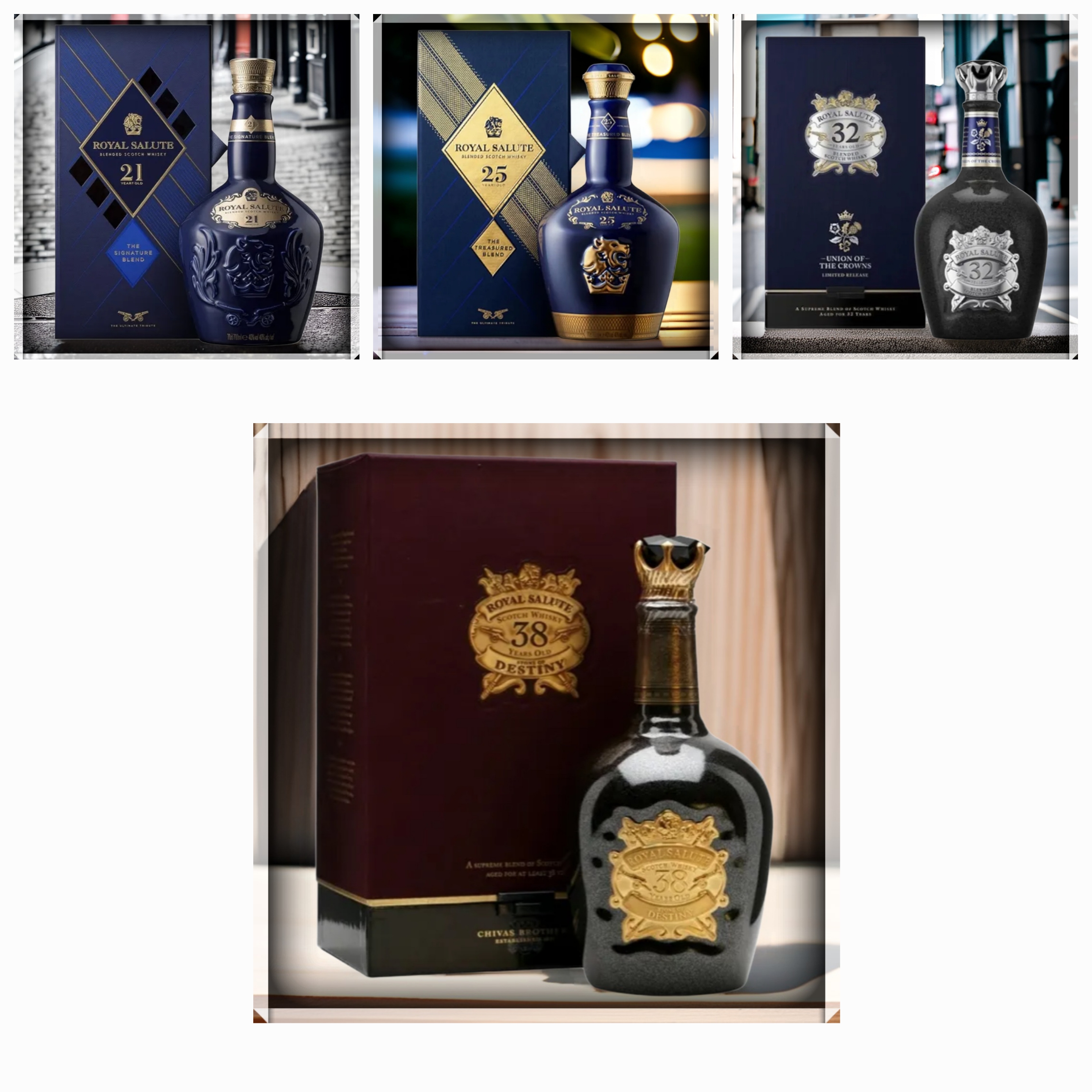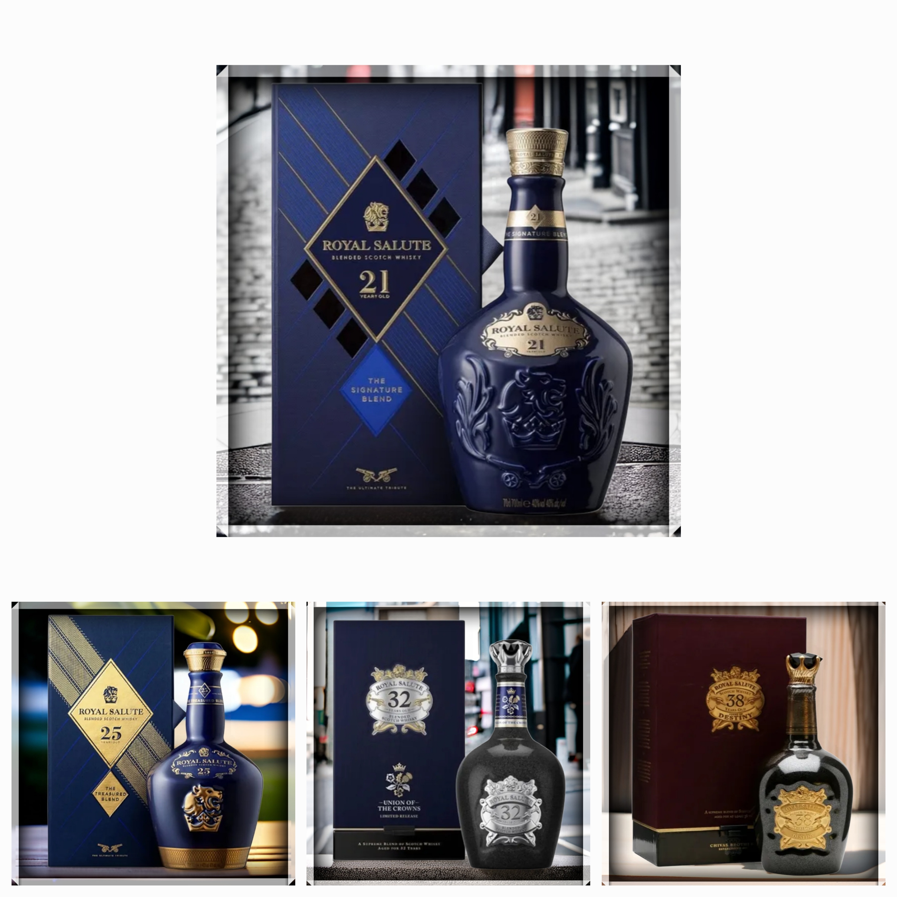 "로얄살루트는 고급 스카치 위스키의 대표 주자로, 21년산부터 38년산까지 각 제품의 가격, 도수, 맛을 한눈에 비교할 수 있습니다."