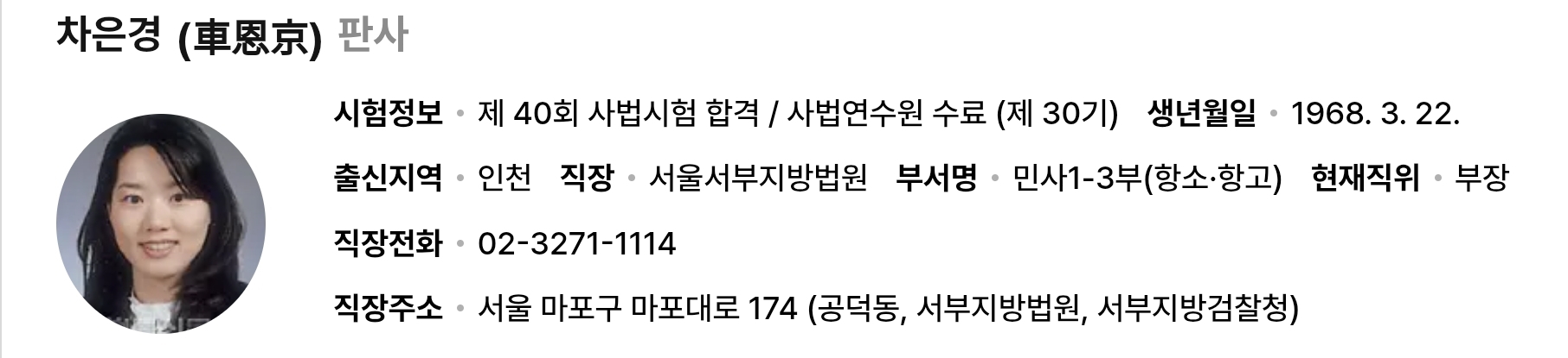 차은경 부장판사는 이화여자대학교 경제학과를 졸업하고 국책연구기관에서 연구원으로 근무한 경력을 가지고 있습니다. 이후 제40회 사법시험에 합격하여 사법연수원 30기를 수료했으며, 대형 로펌을 거쳐 판사로 임용되었습니다. 현재는 서울서부지방법원 민사1-3부에서 항소·항고 사건을 담당하는 부장판사로 재직 중입니다.