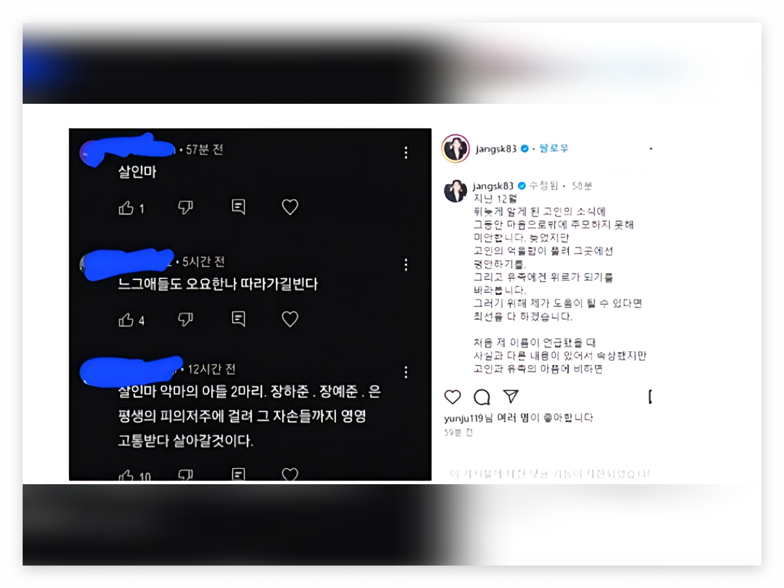이후 네티즌들의 반응은 엇갈렸다. “가족까지 공격하는 건 도를 넘었다”, “장성규를 믿고 응원한다”는 의견이 이어진 반면, “지금에서야 해명하는 것이 의아하다”는 반응도 나왔다. 일부는 “억울하다면 법적으로 대응해야 한다”는 조언을 남기기도 했다.