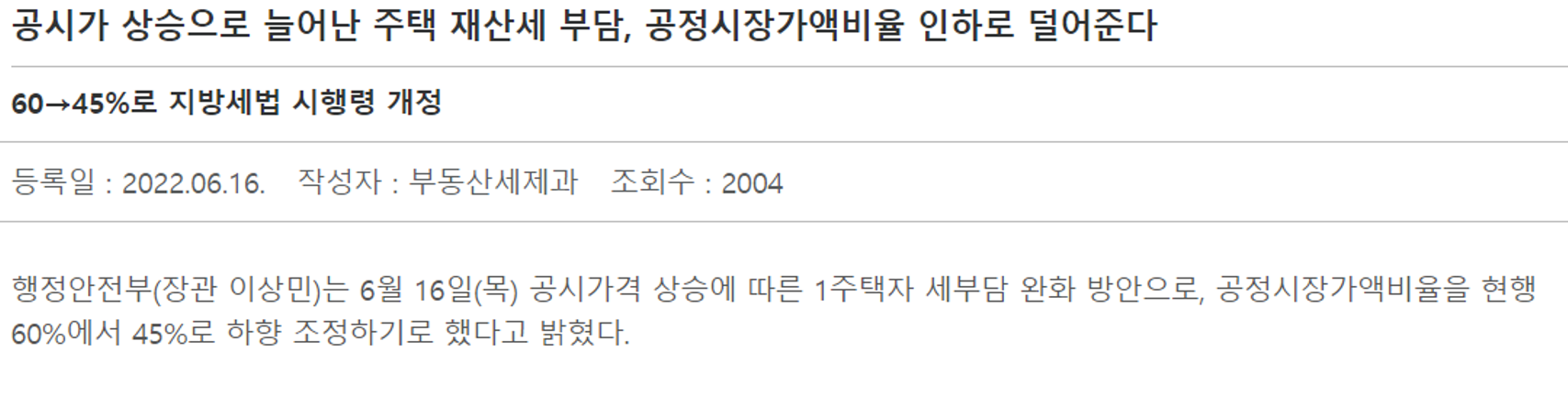 * 공정시장가액 비율 = 대통령령으로 정하는 비율. 주택 60/100 (1세대 1주택 45/100), 토지 및 건축물 70/100