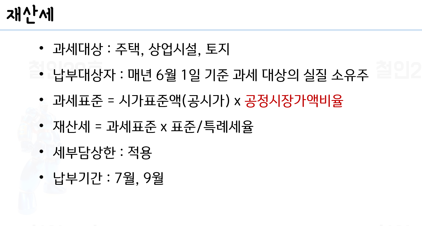 * 세율 = 대상에 따라 차등. 0.2~0.5% (토지, 3단계 누진세율), 0.25%(골프장, 고급오락장, 주거지역 공장 등), 0.1~0.4%(주택, 4단계 누진세율), 0.3%(선박, 항공기, 고급 선박은 5%)