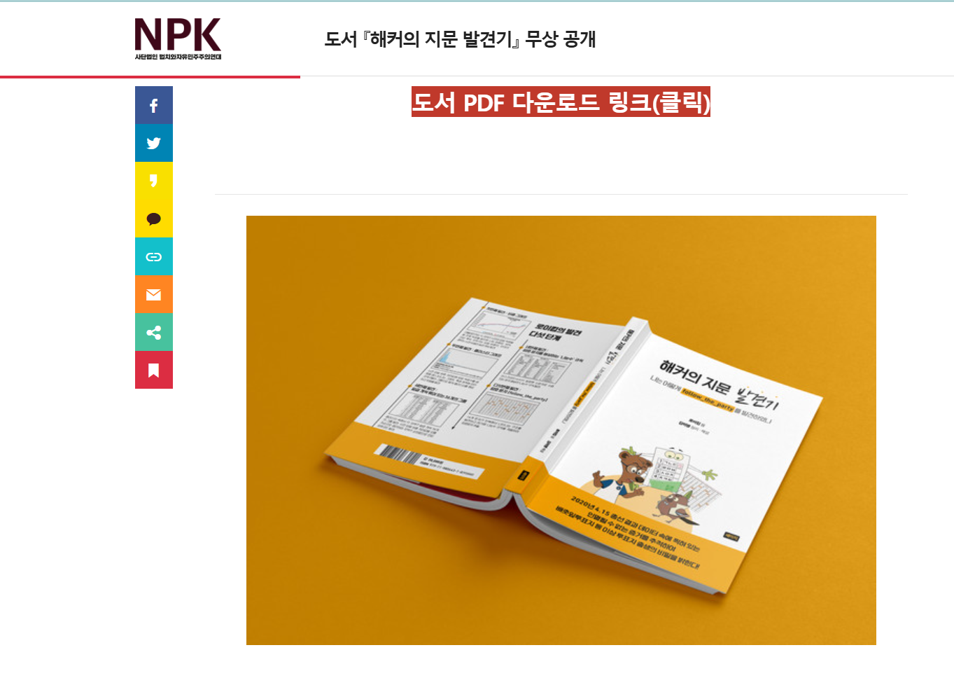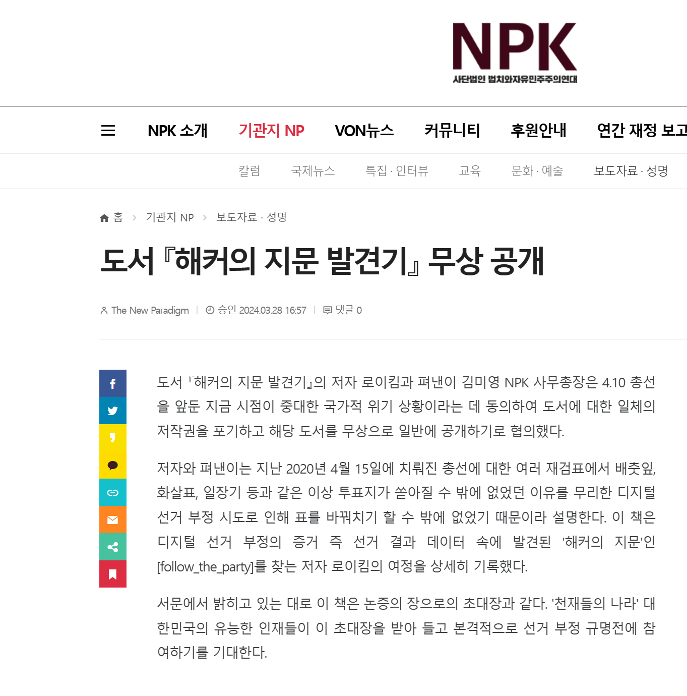 『해커의 지문 발견기』를 집필한 로이킴 작가와 NPK의 김미영 사무총장은 현재 국가가 중대한 위기 상황에 놓여있다는 판단 하에 이 책의 모든 저작권을 포기하고 대중에게 무료로 배포하기로 했습니다.