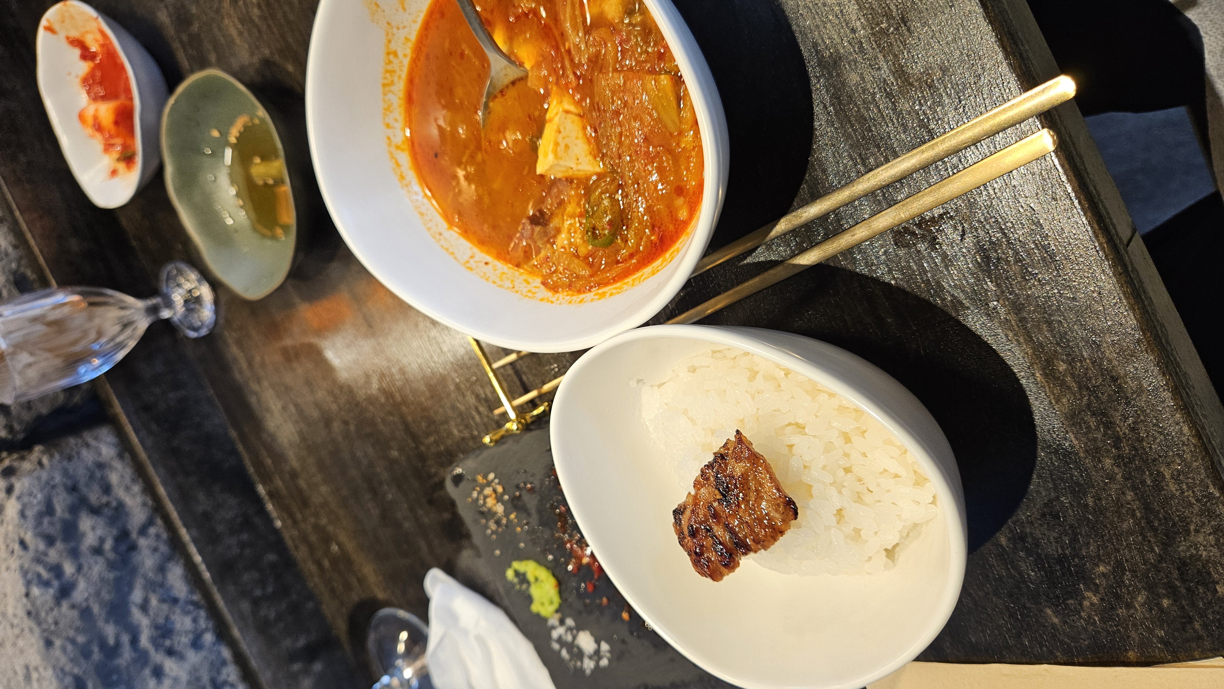 메인 요리는 흑돼지 삼겹살과 샐러드, 그리고 양념갈비와 흑돼지 김치찌개입니다. 삼겹살은 겉은 바삭하고 속은 촉촉하게 구워져 특제 소스와 잘 어울리며, 신선한 샐러드가 곁들여져 조화로운 한 접시가 완성됩니다. 이어지는 김치찌개는 흑돼지의 진한 육향이 국물에 녹아들어 깊은 맛을 자랑하고, 따끈한 흰쌀밥과 함께 먹으면 든든하면서도 정갈한 마무리가 됩니다.