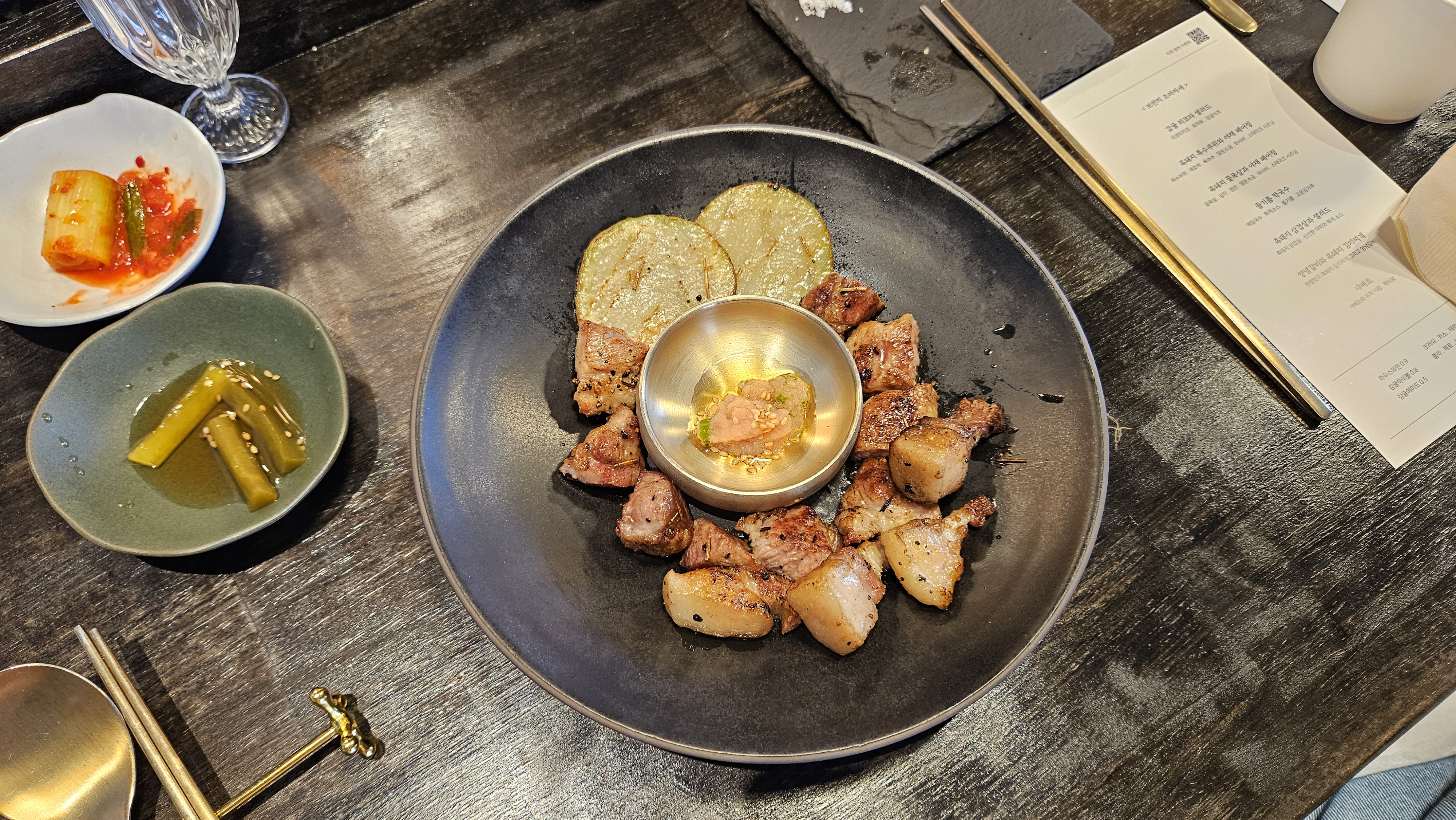 중간에 나오는 들기름 막국수는 고기의 여운을 정리해주는 역할을 합니다. 고소한 들기름 향이 코끝을 자극하고, 특제 소스와 고운 김가루가 어우러진 메밀면은 입 안을 부드럽게 감싸며 깔끔하게 리셋시켜 줍니다. 전체 코스의 템포를 안정적으로 이어주는 중간다리 같은 메뉴입니다.