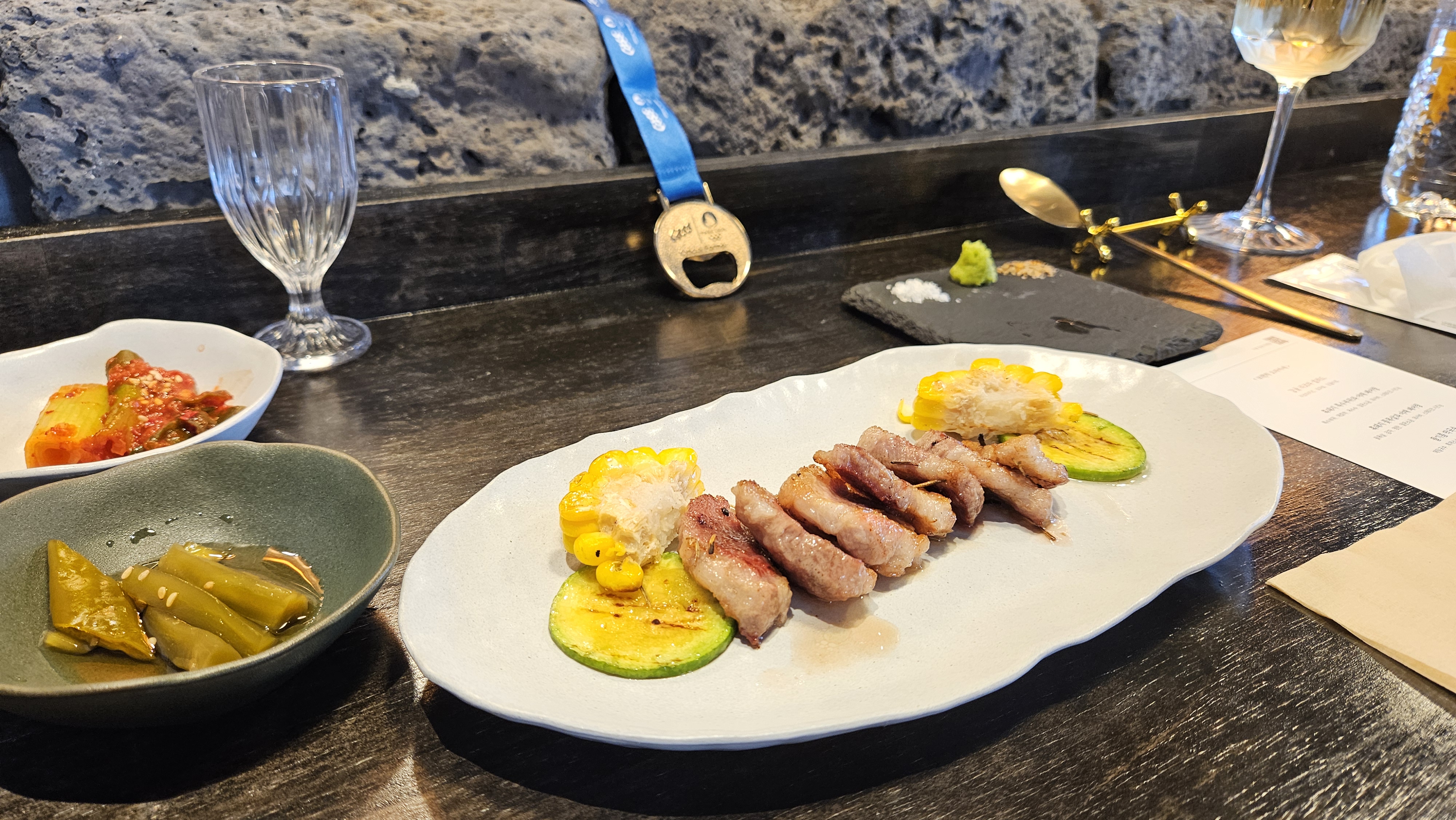 이후 등장하는 흑돼지 특수부위와 야채 페어링은 고기의 풍미를 섬세하게 표현한 메뉴입니다. 특수부위는 쫄깃한 식감과 함께 은은한 고소함이 살아 있고, 애호박과 옥수수, 말돈 소금, 와사비와 함께하면 다양한 맛의 레이어가 느껴져요. 스테이크 시즈닝이 더해져 풍성한 감칠맛까지 챙겼습니다.