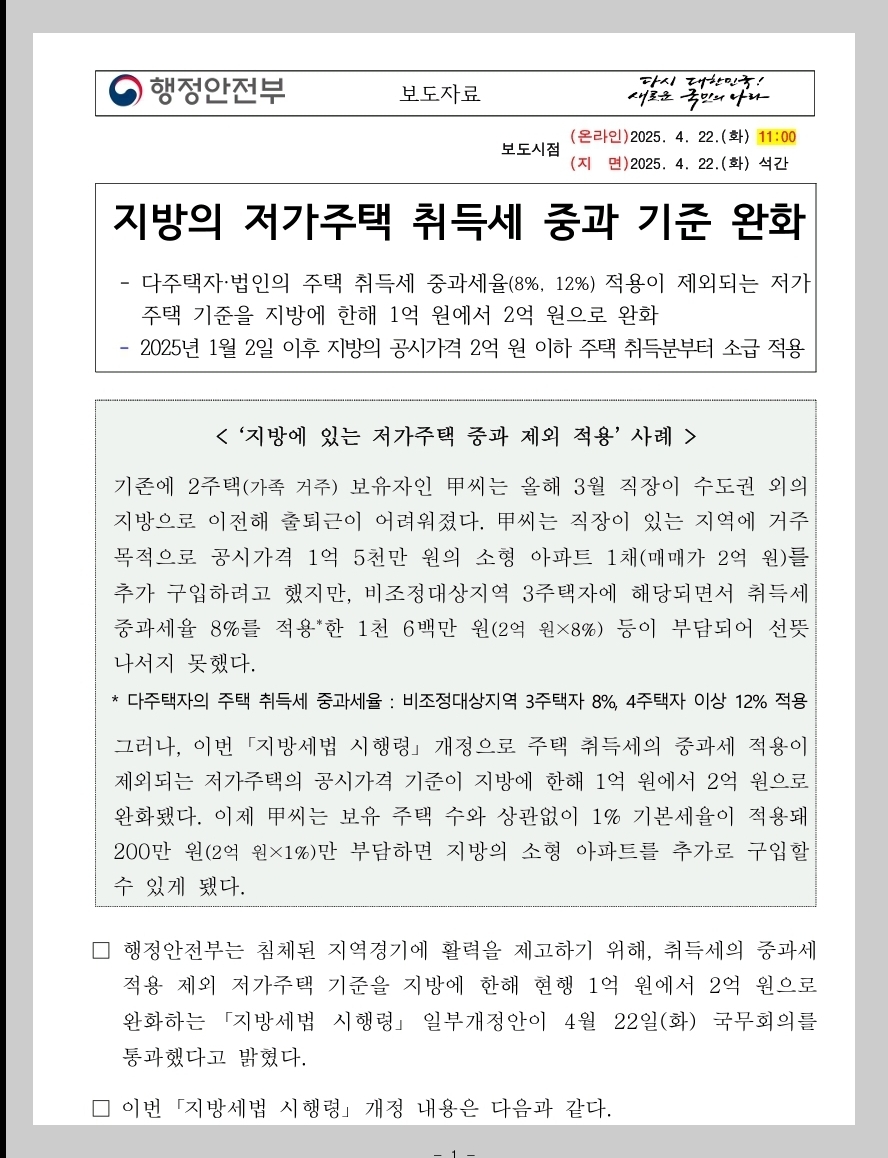 * 저가주택 기준 완화: 지방에 한하여 다주택자 및 법인의 주택 취득세 중과세율(8%, 12%) 적용 제외 기준이 공시가격 1억 원에서 2억 원으로 상향