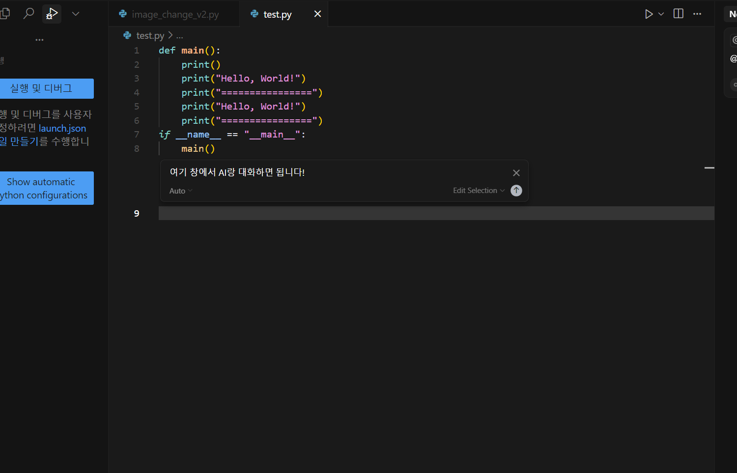 - 코드 선택 후 Ctrl+K를 통해 AI 기능을 호출합니다.