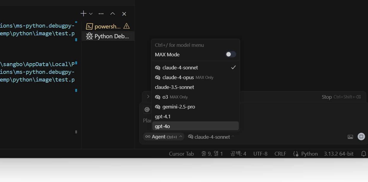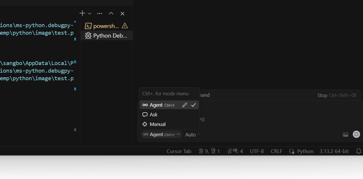 - Cursor AI 관련 상태 (예: 사용 중인 AI 모델, 토큰 사용량 등)가 표시될 수 있습니다.