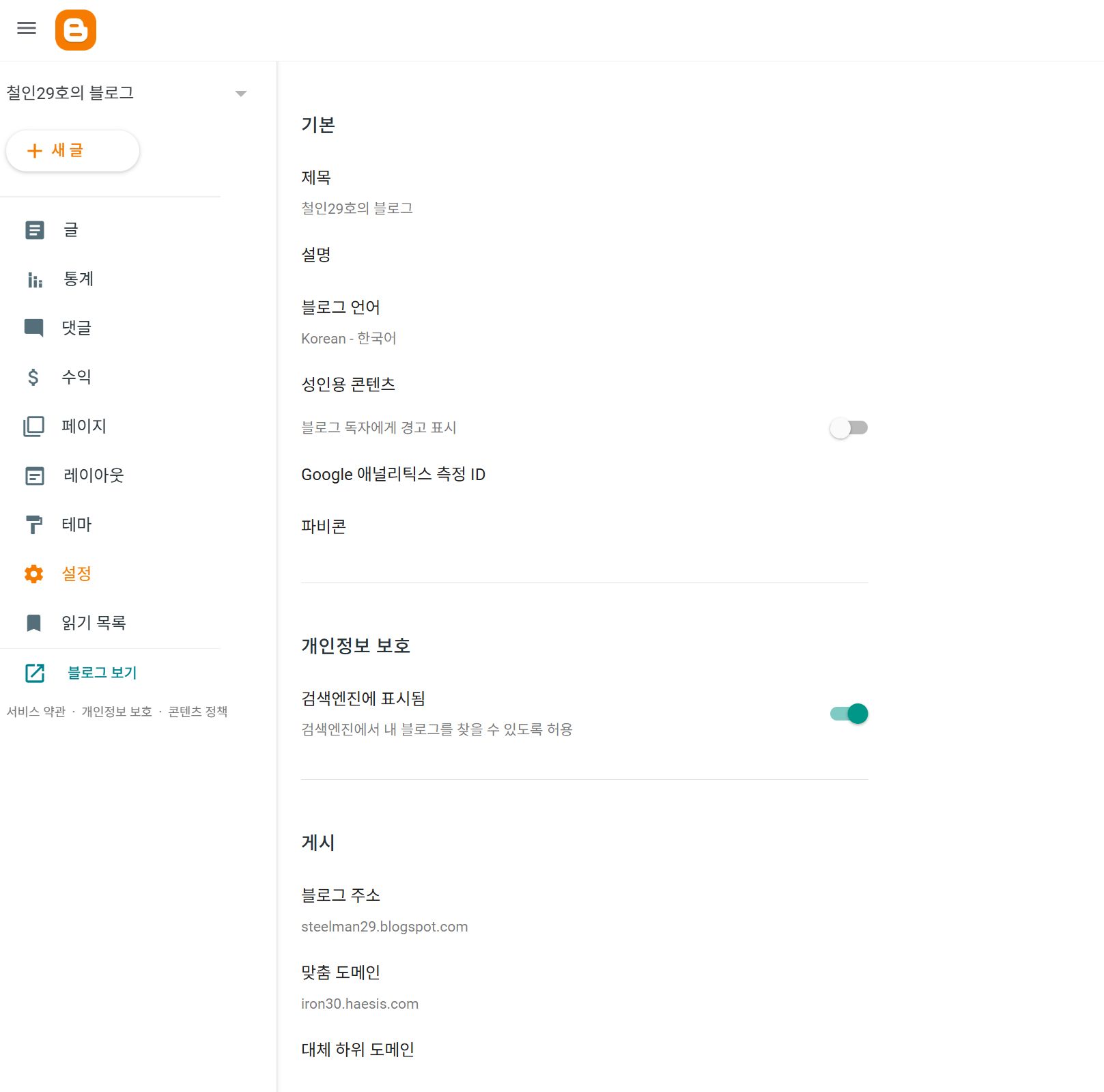 - 연결할 블로그스팟에 로그인한 후, 왼쪽 메뉴에서 **[설정]**으로 이동합니다.