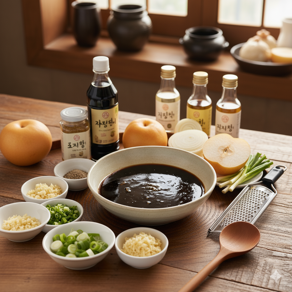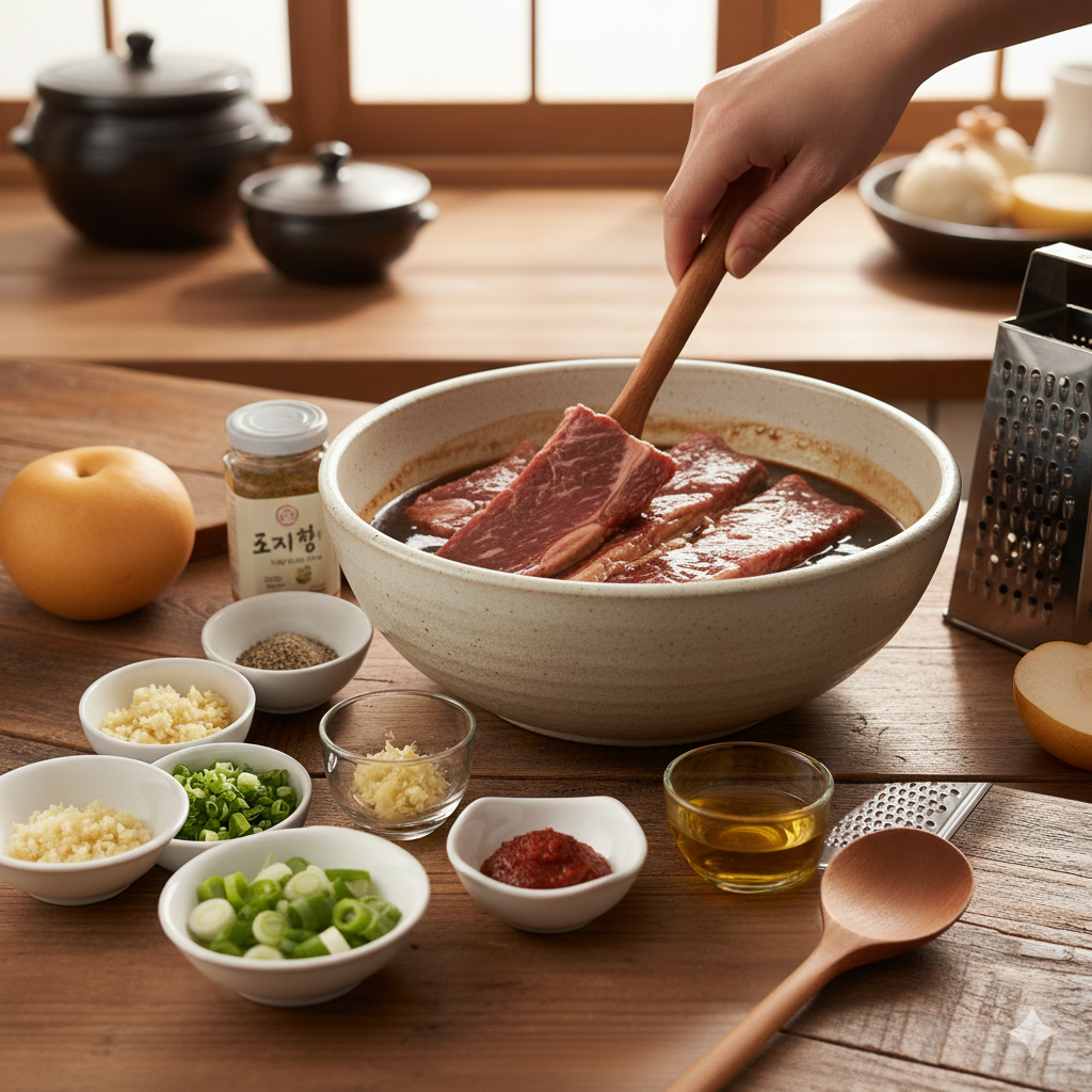 소갈비 양념장의 기본 재료는 간장을 베이스로 합니다. 여기에 다진 마늘과 다진 생강을 넣어 깊은 풍미를 더하고, 배즙이나 간 배를 넣는 것이 가장 큰 특징입니다. 배에 들어있는 천연 효소는 고기를 부드럽게 만들어주고, 자연스러운 단맛을 내주기 때문에 한식 갈비 양념에서 빠질 수 없는 재료입니다. 이것이 바로 한국식 갈비가 세계적으로 사랑받는 이유이기도 합니다.