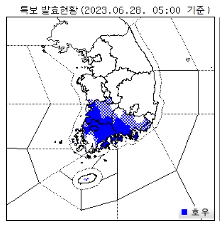 기상청은 6월 28일 수요일 5시 현재 전라권과 경남권, 충남남부, 그리고 제주도산지에 호우특보를 발령했다고 발표했습니다.