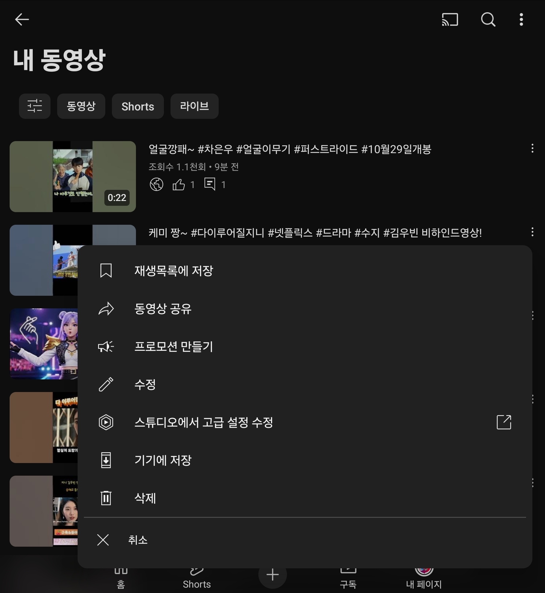 변경하려는 쇼츠를 찾았다면, 해당 영상 제목 옆에 점 세 개로 된 더보기 아이콘이 보일 것입니다. 이 아이콘을 터치하면 여러 옵션이 담긴 메뉴가 펼쳐집니다. 목록에서 수정이라는 항목을 찾아 선택합니다.