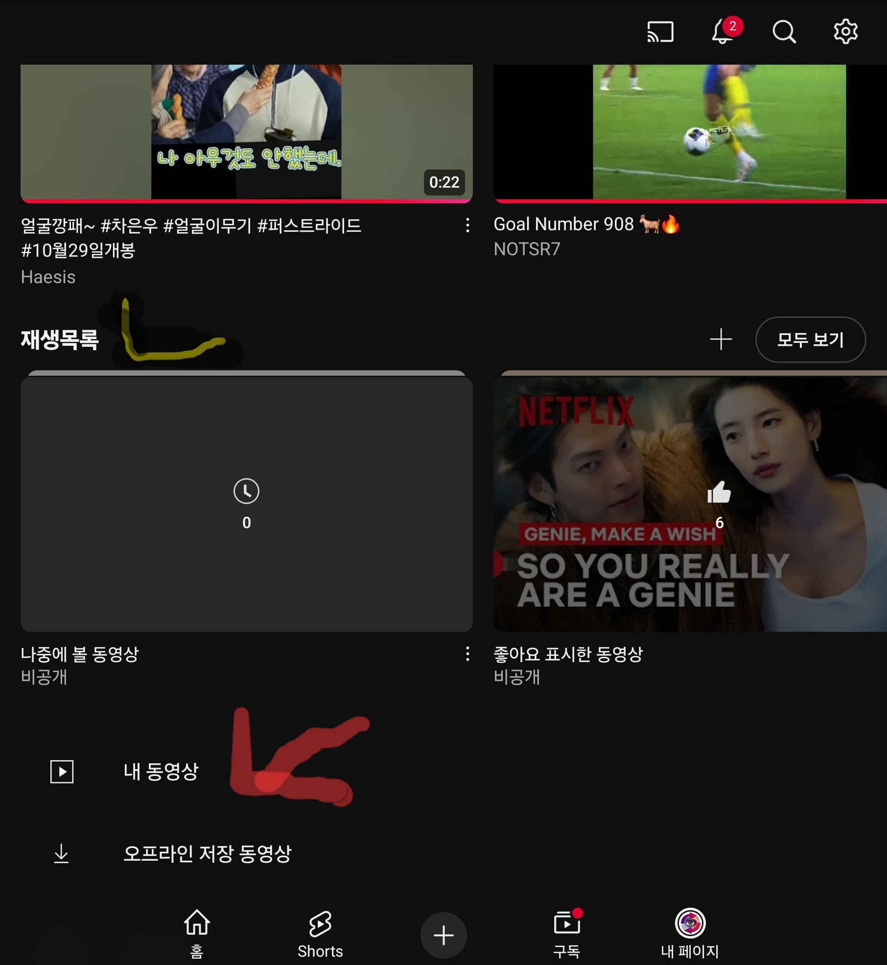 먼저 스마트폰에서 유튜브 어플을 실행합니다. 화면 오른쪽 맨 아래에 위치한 내 페이지 버튼을 눌러줍니다. 이곳은 자신의 채널과 업로드한 영상들을 관리할 수 있는 공간입니다. 화면을 아래로 스크롤하다 보면 내 동영상이라는 메뉴가 나타나는데, 이 섹션으로 들어갑니다.