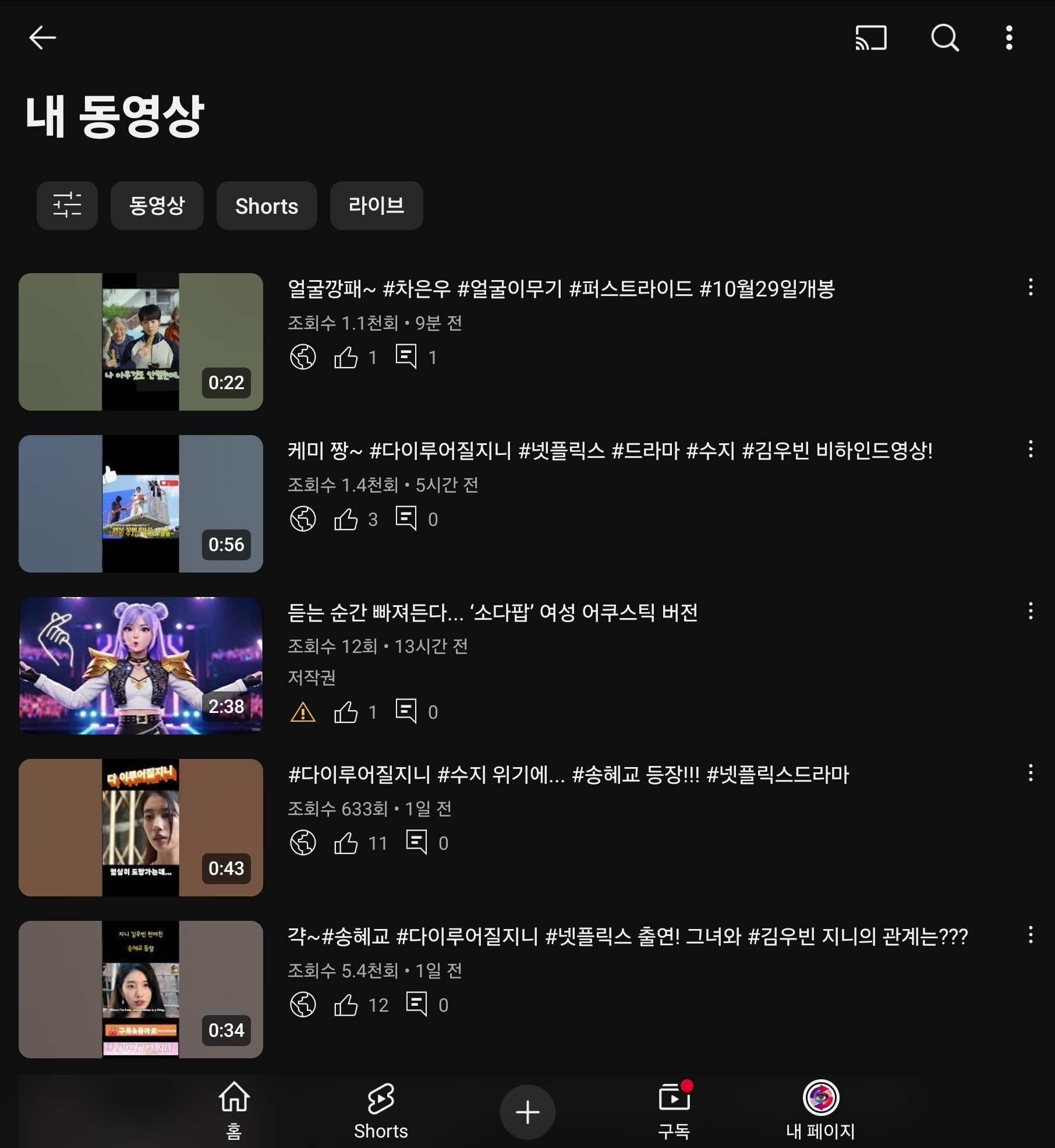내 동영상 화면에서는 일반 영상과 쇼츠가 구분되어 표시됩니다. 상단에 있는 Shorts 탭을 클릭하면 본인이 업로드한 모든 쇼츠 영상들이 리스트로 정리됩니다. 여기서 썸네일을 바꾸고 싶은 특정 쇼츠를 찾아야 합니다.
