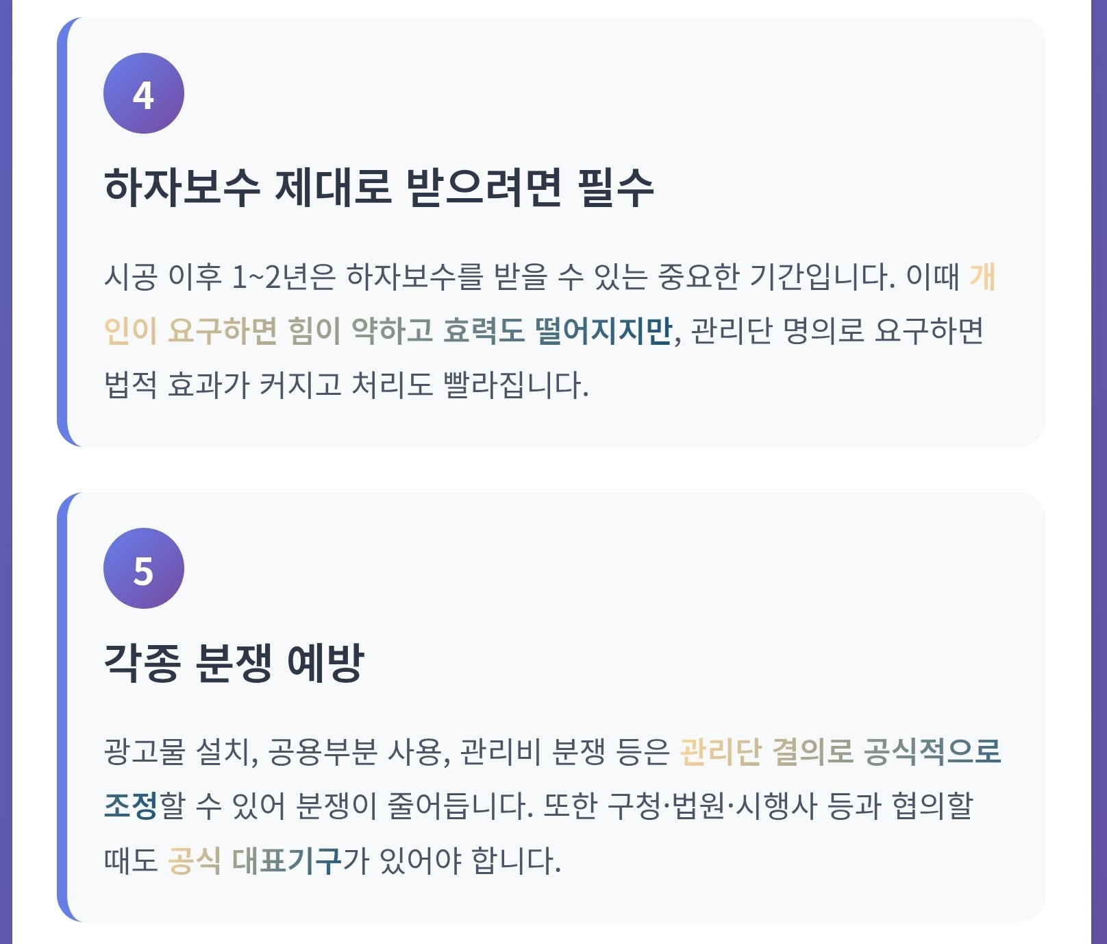 관리단이 없으면 관리비 걷기, 공용시설 관리 등 여러 업무가 법적 정당성을 가지기 어렵습니다.