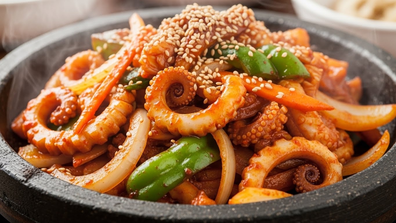 다음은 매콤한 맛이 중독적인 갑오징어 볶음입니다. 갑오징어의 담백한 맛은 매콤한 양념과 환상적인 조화를 이룹니다. 여기에 다양한 채소를 함께 볶아 넣으면, 아삭한 식감과 부드러운 갑오징어의 만남으로 더욱 풍성한 요리가 완성됩니다. 밥반찬으로도, 술안주로도 손색없는 갑오징어 볶음은 가족 모두가 좋아하는 메뉴가 될 것입니다.
