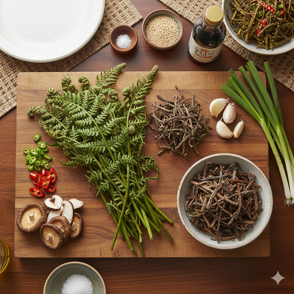 먼저 재료를 준비하세요. 삶은 국산 고사리 300g이 기본입니다. 마른 고사리를 사용한다면 물에 하루 종일 불린 후 부드럽게 삶아두는 게 팁이에요. 여기에 양파 1/2개, 당근 1/2개, 대파 한 줌, 버섯 한 줌 정도 썰어 넣으면 영양과 맛이 업그레이드됩니다. 양념으로는 간장 2큰술, 설탕 1큰술, 다진 마늘 1큰술, 참기름 1큰술, 소금 약간, 깨소금을 약간 넣어요. 이 조합으로 제사 고사리나물을 만들면 구수하고 짭짤한 맛이 제대로 나죠.