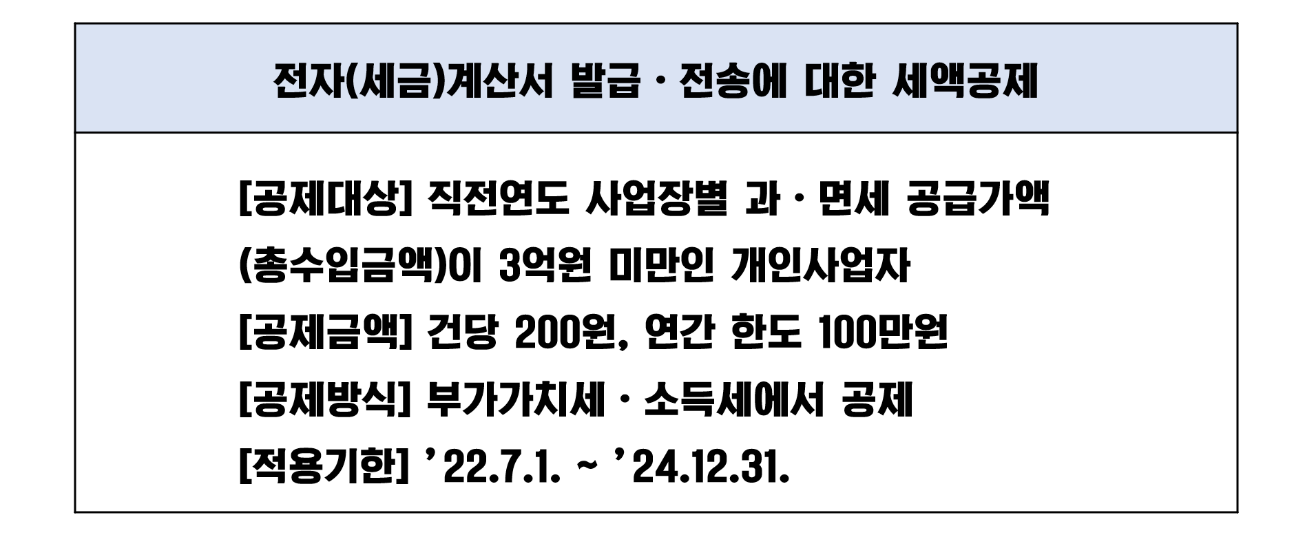 또한 국세청에서는 이에 대한 다양한 혜택도 주고 있습니다. 발급을 하면 즉시 국세청에 전송되므로, 부가가치세 신고서 작성 시 ‘전자세금계산서 발급분’ 란에 합계액만 기재하고, 거래처별 명세 작성 의무가 면제됩니다. 게다가 건당 200원, 연간 100만 원 한도로 발급세액공제를 받을 수 있습니다(직전 연도 공급가액이 3억 원 미만인 개인 일반과세자 대상).