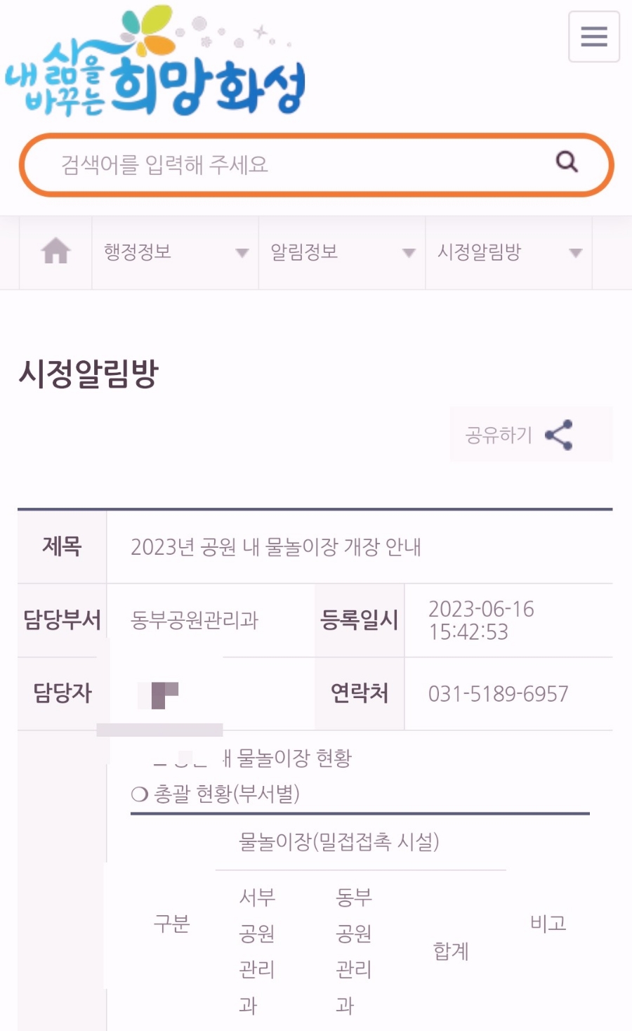 화성시 홈페이지에 들어가서 '시정알림방'이라는 게시판의 여러 글들 중에서 제목이 '2023년 공원 내 물놀이장 개장 안내'라는 것을 보시면 됩니다.