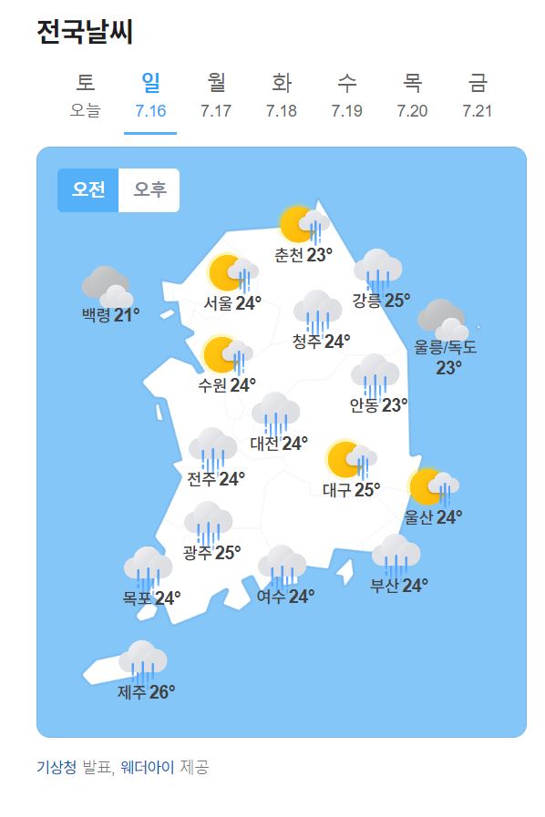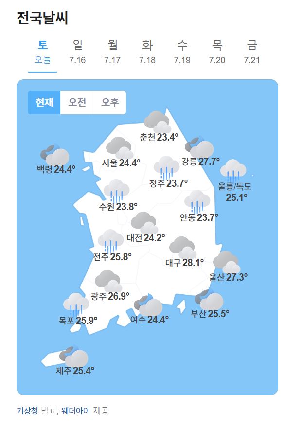2023년 7월 15일 토요일 오늘 날씨 주말 날씨 입니다. 장맛비 계속, 충청 경북 100mm 이상 폭우가 예상되고 있습니다.